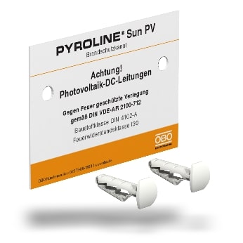 The OBO PYROLINE® Sun PV. The installation duct, made of fibre glass-reinforced lightweight concrete and with a non-conductive surface, ensures protection against dangerous contact voltages. In addition, it fulfils the requirements of the application rule VDE AR-N-E-2100-712 for fireproof and contact-proof installations. This also offers additional protection for the rescue services against electric shocks during extinguishing work. A further advantage: This means that the duct can be routed in exterior areas. It is particularly suitable for the later encasing of previously installed DC cables, as it can be adjusted flexibly to the cable routes. The installation of the duct can take place directly on the wall or ceiling. The appropriate connection armatures mean that suspended mounting is also possible.