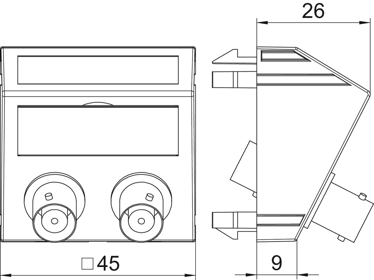 Product descriptionMultimedia support with two BNC connection sockets, slanting cable outlet, with labelling panel, two BNC couplings, socket-socket version. Support plate with locking fastening, suitable for horizontal and vertical installation in the system environment.