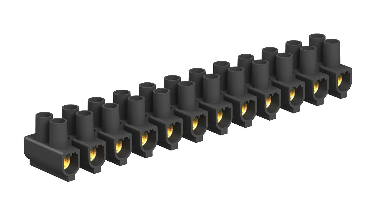Brass terminals, steel screws, electrogalvanised and transparently passivated, 12-pole, individual terminals detachable from strips.