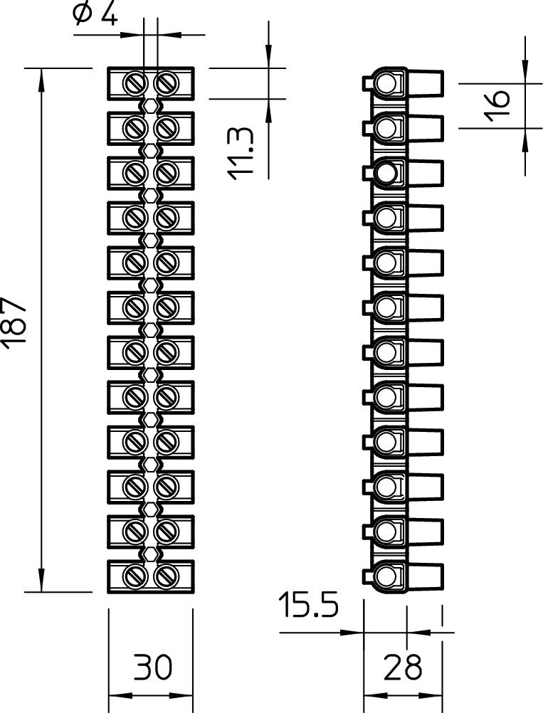 Ambient temperature 80 °C Closing plate required no Colour Black Connectable conductor cross-section, fine-wire without wire-end ferrule, max. 16 mm² Connectable conductor cross-section, fine-wire without wire-end ferrule, min. 16 mm² Connectable conductor cross-section, multi-wire, max. 25 mm² Connectable conductor cross-section, multi-wire, min. 25 mm² Connection position Side Cross-section Max. attachment each side: 25 mm² multi-wire or 16 mm² fine-wire mm² Dimension 25,0mm² Drill hole spacing, centre 16 mm Explosion-tested version no Height 28 mm Length 187 mm Material Polypropylene No. of terminals 12 Nominal cross-section, min. 25 mm² Nominal current 101 A Nominal voltage 750 V Number of screwless terminals per pole 2 Permitted temperature range, max. 80 °C Permitted temperature range, min. -5 °C Pole number 12 Suitable for flexible conductors yes Suitable for multi-wire conductors yes Suitable for solid conductors yes Transparent no Version of electrical connection 1 Screw connection Version of electrical connection 2 Screw connection Width 30 mm - All types