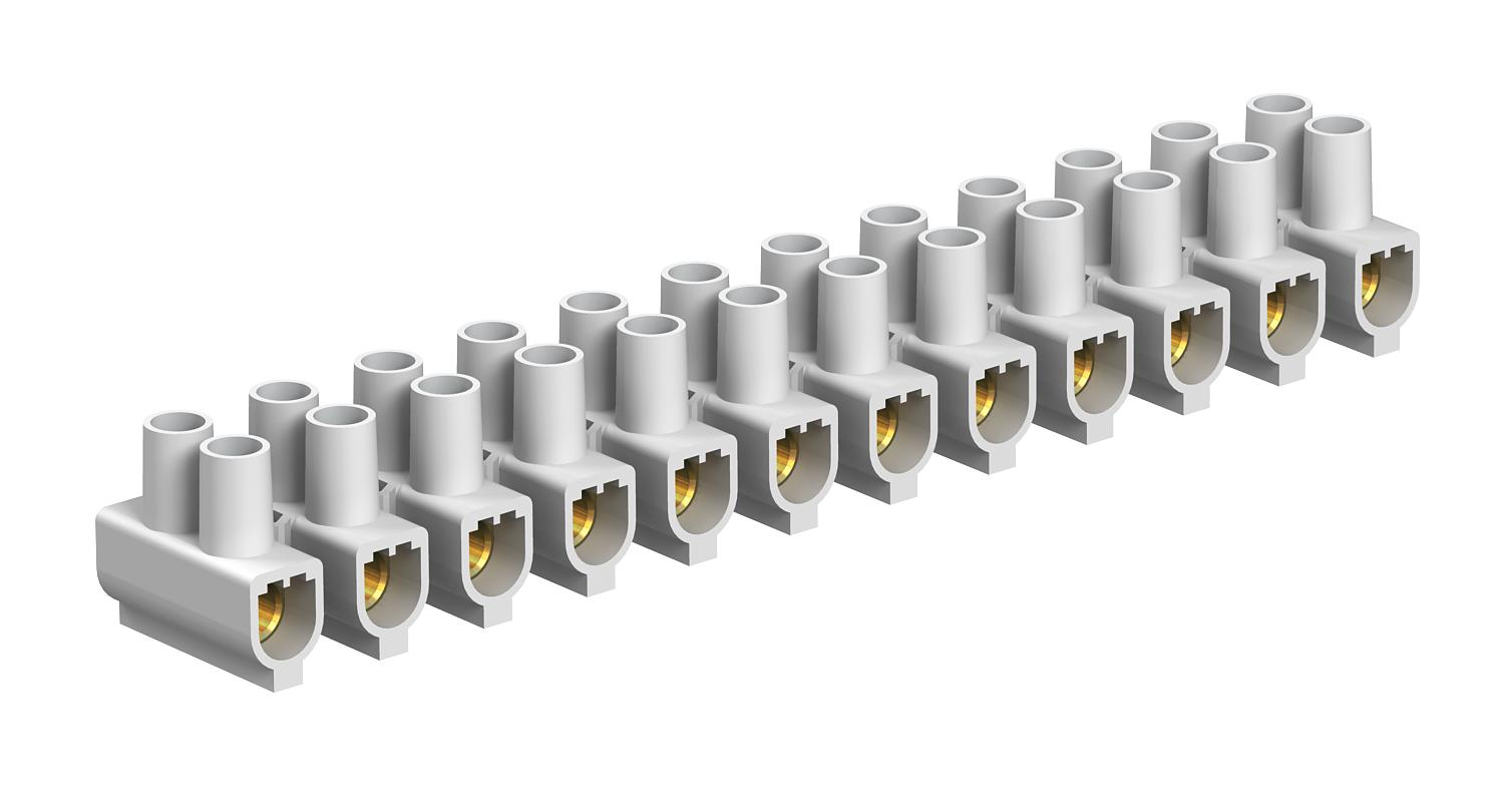 Brass terminals, steel screws, electrogalvanised and transparently passivated, 12-pole, individual terminals detachable from strips.