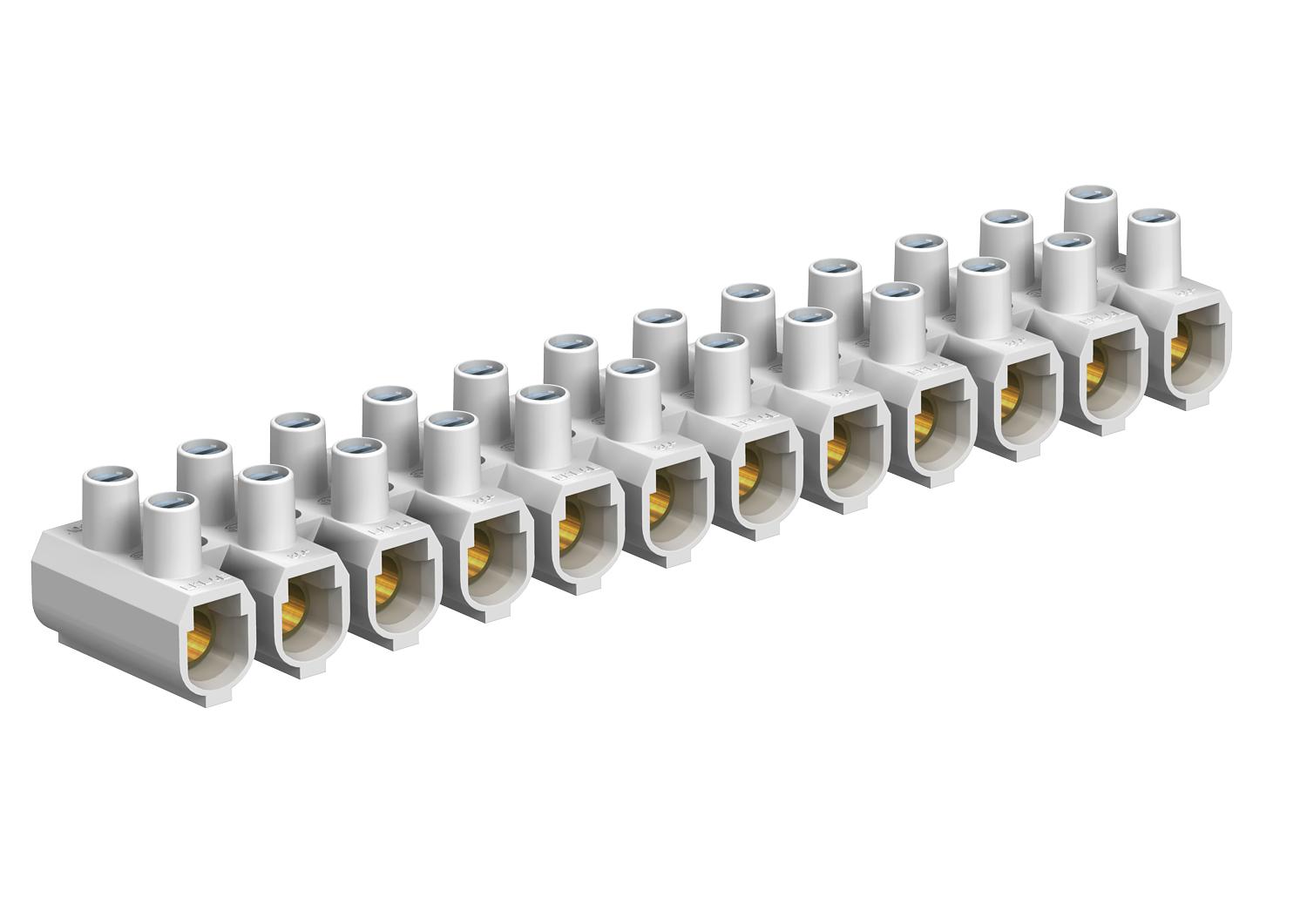 Brass terminals, steel screws, electrogalvanised, 12-pole, individual terminals detachable from strips.