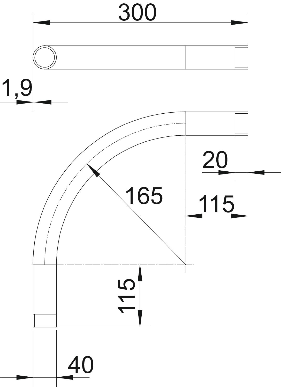 Angle of the bend 90 ° Brushed surface no Dimension M40x1,5 Dimension A 115 mm Dimension B 300 mm Dimension D 40 mm Dimension l 20 mm Dimension m (mm) M40 Dimension R 165 mm Dimension t 1,9 mm Flexible no For nominal pipe diameter 40 mm Halogen-free no Material Aluminium Permitted temperature range, max. 250 °C Permitted temperature range, min. -45 °C Polished surface no Thread M40x1,5 Two-part no Version for Thread With inspection opening and lid no With sleeve yes - All types