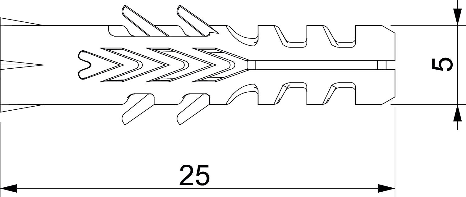 Colour Light grey Diameter 5 mm Dimension 5x25 Dimension D 5 mm Dimension L 25 mm Drill hole depth 30 mm Drill hole diameter, min. 5 mm Halogen-free yes Length 25 mm Material Polyamide Suitable for fastening with cable ties no Suitable for hexagonal wood screw yes Version for Universal anchor With bolts no Wood screws 2,5-4 - All types