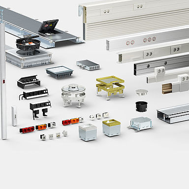 Cable routing and underfloor systems for administrative and functional buildings including architectural solutions