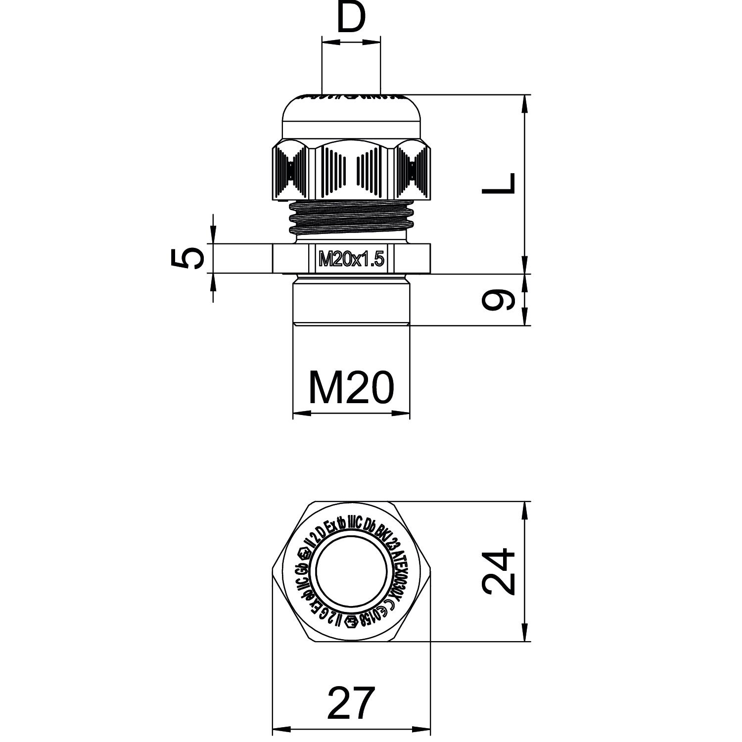 Bend protection no CO2 Footprint (GWP) Cradle-to-Gate 0,0469 kg CO2e / 1 Piece Colour Black Dimension M20 Dimension E 27 mm Dimension G M20 mm Dimension L max. 30 mm Dimension L min. 23 mm Dimension L1 9 mm Dimension L2 5 mm explosion-proof yes Fibre-glass reinforced no Flat cable gland no For Ex zone yes For Ex zone dust 21, 22 For Ex zone gas 1, 2 Halogen-free yes Hexagonal corner dimension 27 mm Impact-resistant no Material Polyamide Nominal thread size 20 Permitted temperature range, max. 40 °C Permitted temperature range, min. -10 °C Protection rating IP68 Sealing area D, max. 12 mm Sealing area D, min. 7 mm Sealing insert, multiple no Splittable gland no Strain relief option no Thread M20 x 1,5 Thread increase 1,5 mm Thread length 9 mm Thread type Metric Type of seal Sealing ring Unstable torque 4 Nm Version for Straight WAF 24 With locknut no - All types