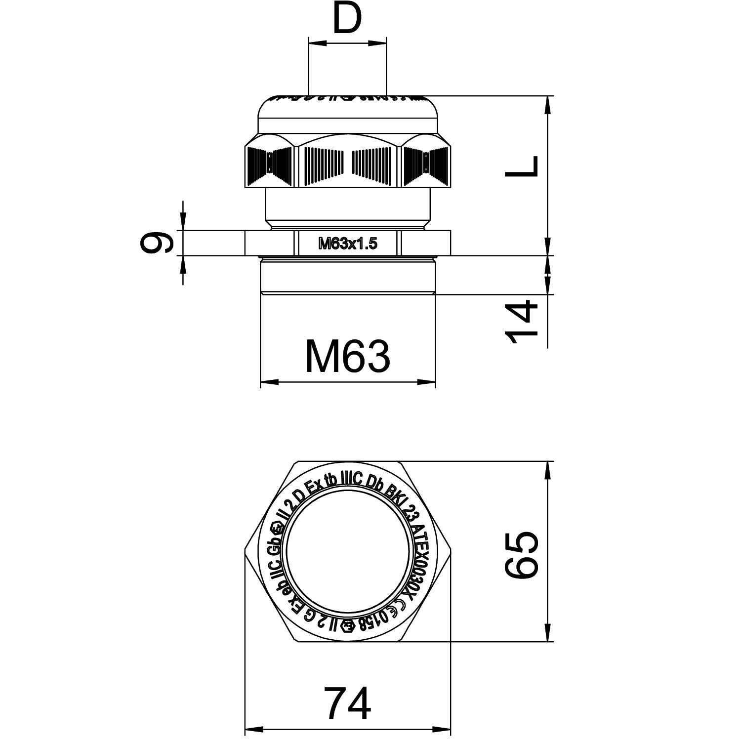 Bend protection no CO2 Footprint (GWP) Cradle-to-Gate 0,4471 kg CO2e / 1 Piece Colour Black Dimension M63 Dimension E 74 mm Dimension G M63 mm Dimension L max. 58 mm Dimension L min. 42 mm Dimension L1 14 mm Dimension L2 9 mm explosion-proof yes Fibre-glass reinforced no Flat cable gland no For Ex zone yes For Ex zone dust 21, 22 For Ex zone gas 1, 2 Halogen-free yes Hexagonal corner dimension 74 mm Impact-resistant no Material Polyamide Nominal thread size 63 Permitted temperature range, max. 65 °C Permitted temperature range, min. -20 °C Protection rating IP68 Sealing area D, max. 44 mm Sealing area D, min. 36 mm Sealing insert, multiple no Splittable gland no Strain relief option no Thread M63 x 1,5 Thread increase 1,5 mm Thread length 14 mm Thread type Metric Type of seal Sealing ring Unstable torque 22 Nm Version for Straight WAF 65 With locknut no - All types