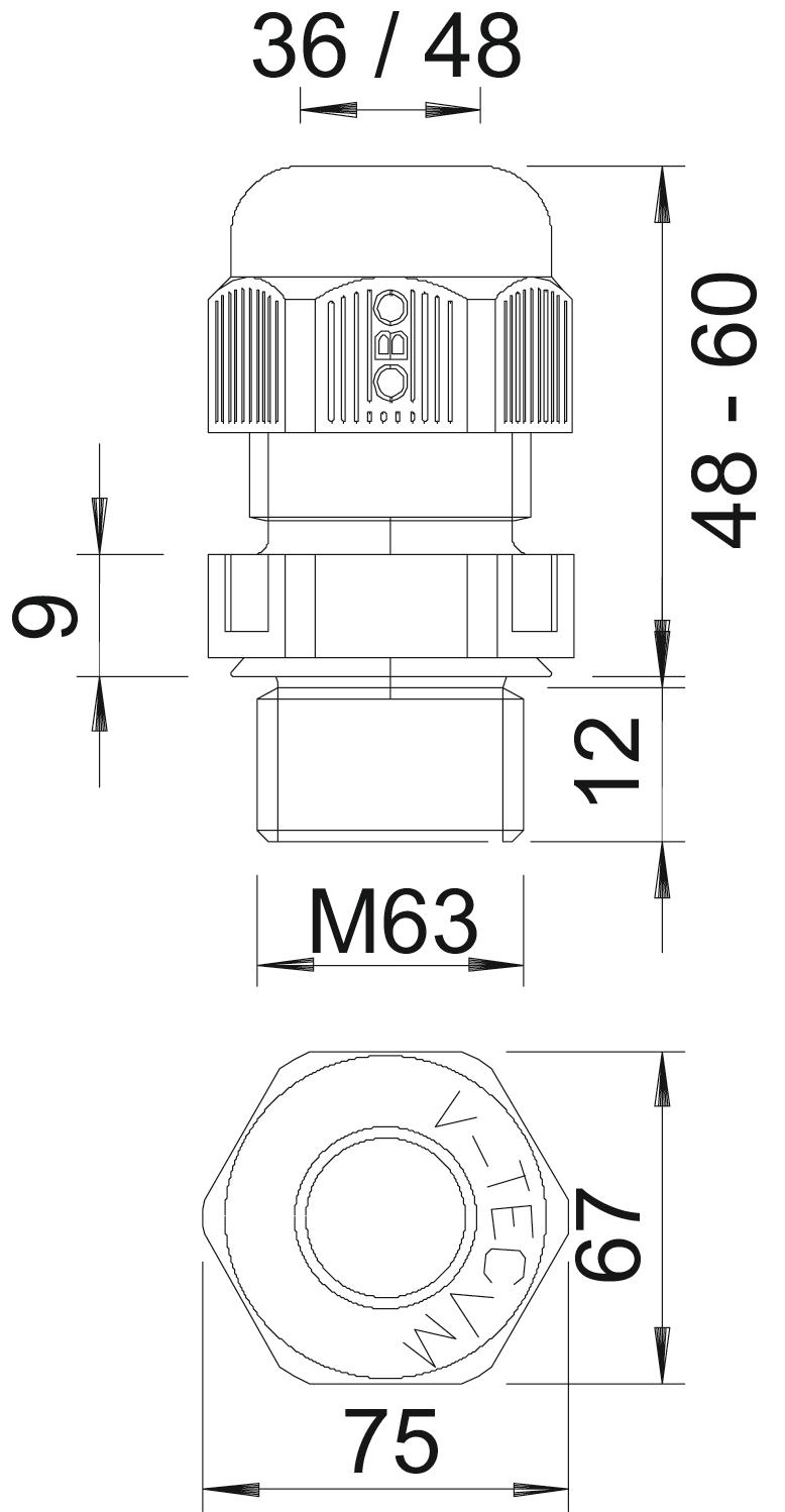 Bend protection no CO2 Footprint (GWP) Cradle-to-Gate 0,4193 kg CO2e / 1 Piece Colour Black Dimension M63 Dimension E 75 mm Dimension L max. 60 mm Dimension L min. 48 mm Dimension L1 12 mm Dimension L2 9 mm explosion-proof no Fibre-glass reinforced no Flame-resistant acc. to VDE 0471/DIN 695 Part 2-1, test temperature 650°C Flat cable gland no For Ex zone Without For Ex zone dust Without For Ex zone gas Without Halogen-free yes Hexagonal corner dimension 75 mm Impact-resistant no Material Polyamide Nominal thread size 63 Permitted temperature range, max. 65 °C Permitted temperature range, min. -20 °C Protection rating IP68 Sealing area D, max. 48 mm Sealing area D, min. 36 mm Sealing insert, multiple no Splittable gland no Strain relief option yes Thread M63 x 1,5 Thread increase 1,5 mm Thread length 12 mm Thread type Metric Type of seal Sealing ring Unstable torque 15 Nm Version for Straight WAF 67 With locknut no - All types