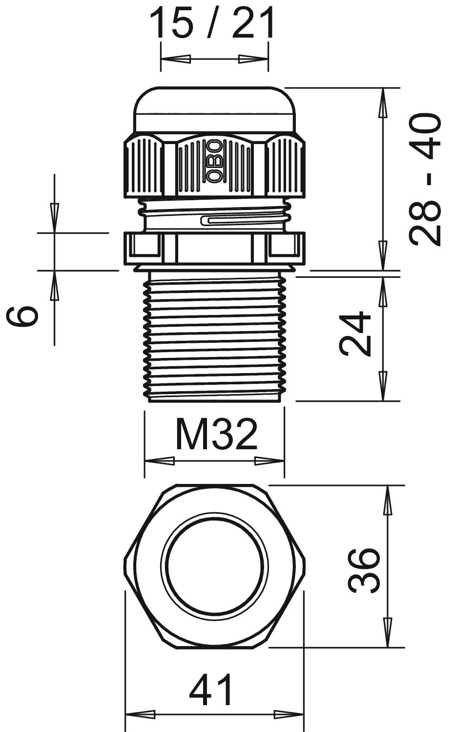Bend protection no CO2 Footprint (GWP) Cradle-to-Gate 0,1257 kg CO2e / 1 Piece Colour Black Dimension M32 Dimension E 41 mm Dimension L max. 40 mm Dimension L min. 28 mm Dimension L1 24 mm Dimension L2 6 mm explosion-proof no Fibre-glass reinforced no Flame-resistant acc. to VDE 0471/DIN 695 Part 2-1, test temperature 650°C Flat cable gland no For Ex zone Without For Ex zone dust Without For Ex zone gas Without Halogen-free yes Hexagonal corner dimension 41 mm Impact-resistant no Material Polyamide Nominal thread size 32 Permitted temperature range, max. 65 °C Permitted temperature range, min. -20 °C Protection rating IP68 Sealing area D, max. 21 mm Sealing area D, min. 15 mm Sealing insert, multiple no Splittable gland no Strain relief option yes Thread M32 x 1,5 Thread increase 1,8 mm Thread length 24 mm Thread type Metric Type of seal Sealing ring Unstable torque 7,5 Nm Version for Straight WAF 36 With locknut no - All types