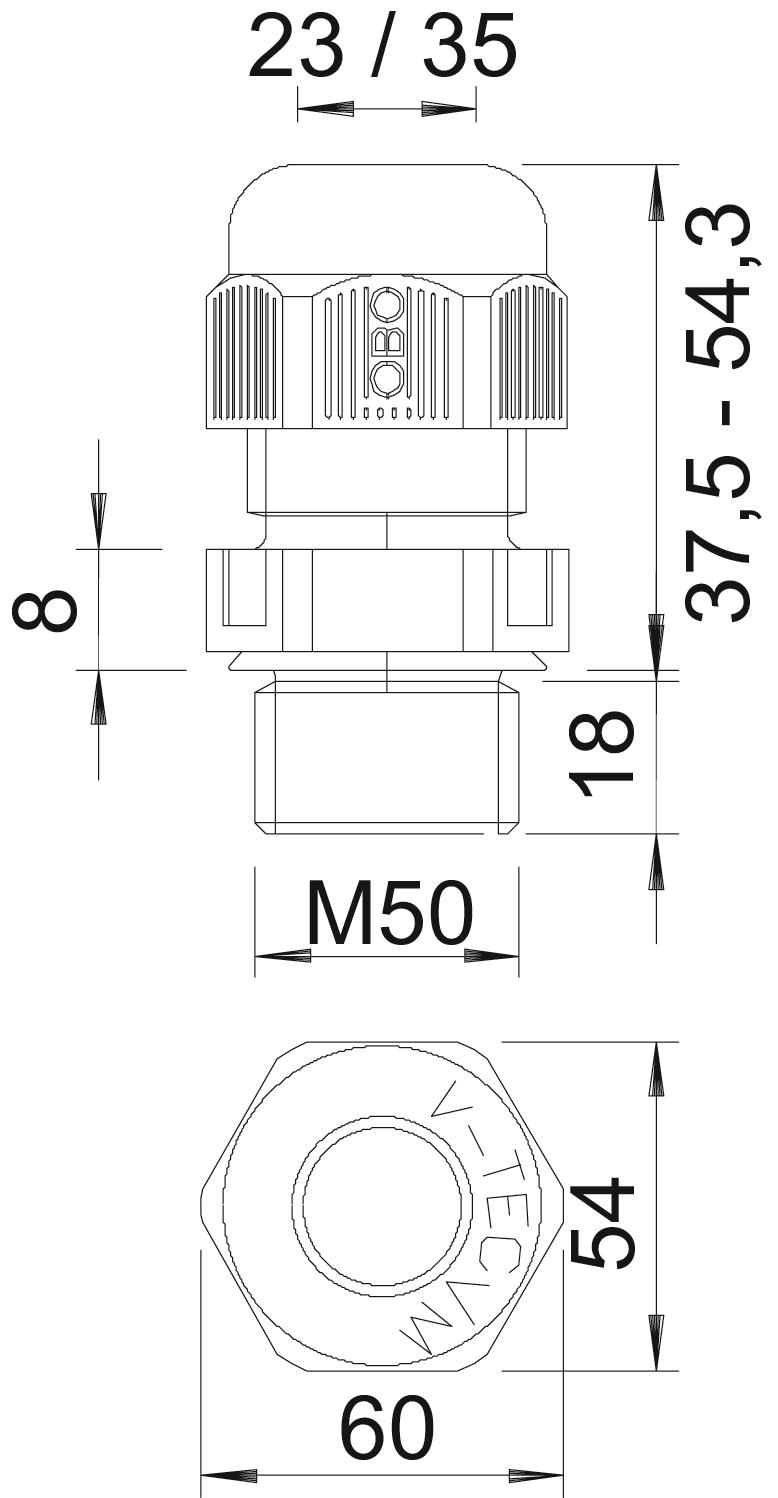 Bend protection no CO2 Footprint (GWP) Cradle-to-Gate 0,3035 kg CO2e / 1 Piece Colour Light grey; RAL 7035 Dimension M50 Dimension E 60 mm Dimension L max. 54,3 mm Dimension L min. 37,5 mm Dimension L1 18 mm Dimension L2 8 mm explosion-proof no Fibre-glass reinforced no Flame-resistant acc. to VDE 0471/DIN 695 Part 2-1, test temperature 650°C Flat cable gland no For Ex zone Without For Ex zone dust Without For Ex zone gas Without Halogen-free yes Hexagonal corner dimension 60 mm Impact-resistant no Material Polyamide Nominal thread size 50 Permitted temperature range, max. 65 °C Permitted temperature range, min. -20 °C Protection rating IP68 Sealing area D, max. 35 mm Sealing area D, min. 23 mm Sealing insert, multiple no Splittable gland no Strain relief option yes Thread M50 x 1,5 Thread increase 1,5 mm Thread length 18 mm Thread type Metric Type of seal Sealing ring Unstable torque 12 Nm Version for Straight WAF 54 With locknut no - All types