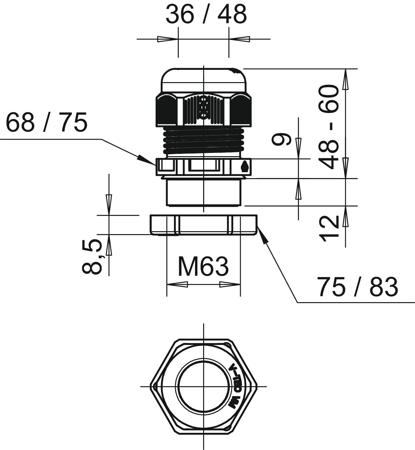 Bend protection no CO2 Footprint (GWP) Cradle-to-Gate 0,4821 kg CO2e / 1 Piece Colour Light grey; RAL 7035 Dimension M63 Dimension E1 (mm) 75 mm Dimension E2 83 mm Dimension L max. 60 mm Dimension L min. 48 mm Dimension L1 12 mm Dimension L2 9 mm Dimension L3 8,5 mm explosion-proof no Fibre-glass reinforced no Flame-resistant acc. to VDE 0471/DIN 695 Part 2-1, test temperature 650°C Flat cable gland no For Ex zone Without For Ex zone dust Without For Ex zone gas Without Halogen-free yes Impact-resistant no Material Polyamide Nominal thread size 63 Permitted temperature range, max. 65 °C Permitted temperature range, min. -20 °C Protection rating IP68 Sealing area D, max. 48 mm Sealing area D, min. 36 mm Sealing insert, multiple no Splittable gland no Strain relief option yes Thread M63 x 1,5 Thread increase 1,5 mm Thread length 12 mm Thread type Metric Type of seal Sealing ring Unstable torque 15 Nm Version for Straight WAF 1 68 mm WAF 2 75 mm With locknut no - All types