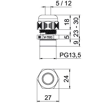 Bend protection no CO2 Footprint (GWP) Cradle-to-Gate 0,0487 kg CO2e / 1 Piece Colour Light grey; RAL 7035 Dimension PG13,5 Dimension E 27 mm Dimension L max. 30 mm Dimension L min. 23 mm Dimension L1 9 mm Dimension L2 5 mm Dimension L3 18 mm explosion-proof no Fibre-glass reinforced no Flat cable gland no For Ex zone Without For Ex zone dust Without For Ex zone gas Without Halogen-free yes Hexagonal corner dimension 27 mm Impact-resistant no Material Polyamide Nominal thread size 13,5 Permitted temperature range, max. 65 °C Permitted temperature range, min. -20 °C Protection rating IP68 Sealing area D, max. 12 mm Sealing area D, min. 5 mm Sealing insert, multiple no Splittable gland no Strain relief option yes Thread Pg 13,5 Thread increase 1,41 mm Thread length 9 mm Thread type PG Type of seal Sealing ring Unstable torque 2,5 Nm Version for Straight WAF 24 With locknut no - All types
