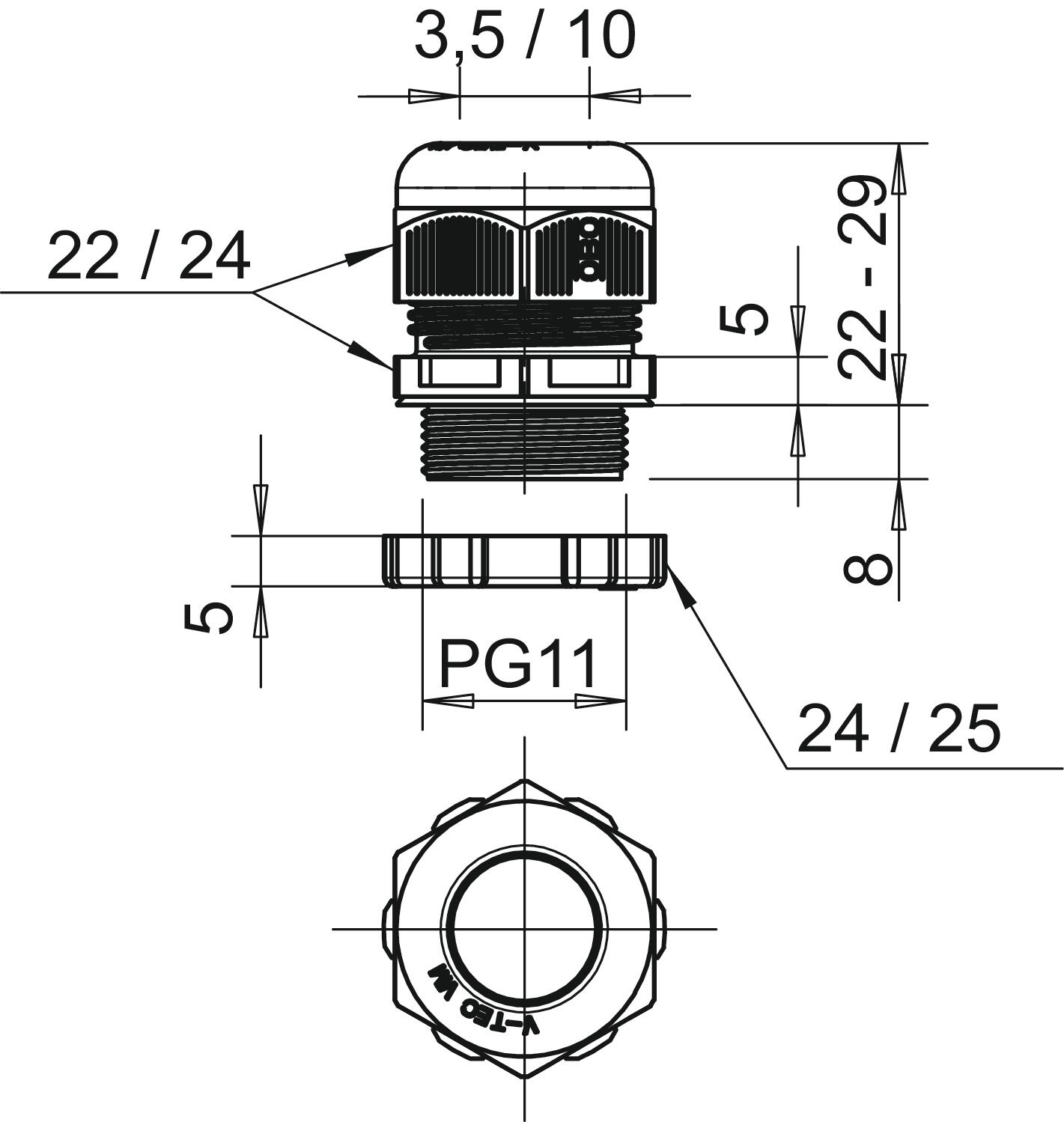 Bend protection no CO2 Footprint (GWP) Cradle-to-Gate 0,0509 kg CO2e / 1 Piece Colour Light grey; RAL 7035 Dimension PG11 Dimension E1 (mm) 25 mm Dimension E2 24 mm Dimension L max. 29 mm Dimension L min. 22 mm Dimension L1 8 mm Dimension L2 5 mm Dimension L3 5 mm explosion-proof no Fibre-glass reinforced no Flat cable gland no For Ex zone Without For Ex zone dust Without For Ex zone gas Without Halogen-free yes Hexagonal corner dimension 25 mm Impact-resistant no Material Polyamide Nominal thread size 11 Permitted temperature range, max. 65 °C Permitted temperature range, min. -20 °C Protection rating IP68 Sealing area D, max. 10 mm Sealing area D, min. 3,5 mm Sealing insert, multiple no Splittable gland no Strain relief option yes Thread Pg 11 Thread increase 1,5 mm Thread length 8 mm Thread type PG Type of seal Sealing ring Version for Straight WAF 1 22 mm WAF 2 24 mm With locknut yes - All types