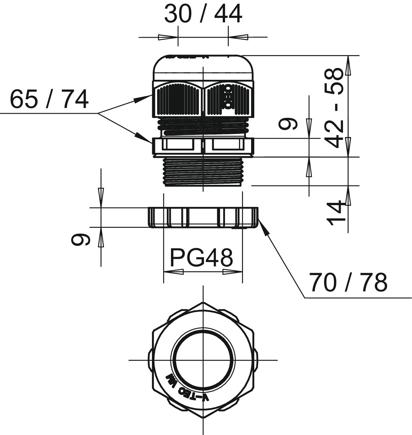 Bend protection no CO2 Footprint (GWP) Cradle-to-Gate 0,5465 kg CO2e / 1 Piece Colour Light grey; RAL 7035 Dimension PG48 Dimension E1 (mm) 74 mm Dimension E2 78 mm Dimension L max. 58 mm Dimension L min. 42 mm Dimension L1 14 mm Dimension L2 9 mm Dimension L3 8 mm explosion-proof no Fibre-glass reinforced no Flat cable gland no For Ex zone Without For Ex zone dust Without For Ex zone gas Without Halogen-free yes Hexagonal corner dimension 74 mm Impact-resistant no Material Polyamide Nominal thread size 48 Permitted temperature range, max. 65 °C Permitted temperature range, min. -20 °C Protection rating IP68 Sealing area D, max. 44 mm Sealing area D, min. 30 mm Sealing insert, multiple no Splittable gland no Strain relief option yes Thread Pg 48 Thread increase 1,5 mm Thread length 14 mm Thread type PG Type of seal Sealing ring Version for Straight WAF 1 65 mm WAF 2 70 mm With locknut yes - All types