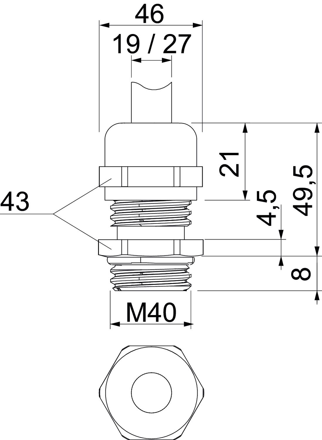 Bend protection no CO2 Footprint (GWP) Cradle-to-Gate 0,3351 kg CO2e / 1 Piece Dimension M40 Dimension E 46 mm Dimension L max. 49,5 mm Dimension L1 8 mm Dimension L2 4,5 mm Dimension L3 21 mm Fibre-glass reinforced no Flat cable gland no For Ex zone Without Halogen-free no Impact-resistant no Material Brass Permitted temperature range, max. 100 °C Permitted temperature range, min. -20 °C Protection rating IP68 Sealing area D, max. 27 mm Sealing area D, min. 19 mm Sealing insert, multiple no Strain relief option yes Surface Nickel-plated Thread M40 x 1,5 Thread length 8 mm Thread type Metric Type of seal Sealing ring Unstable torque 13,5 Nm Version for Straight WAF 43 With locknut no - All types