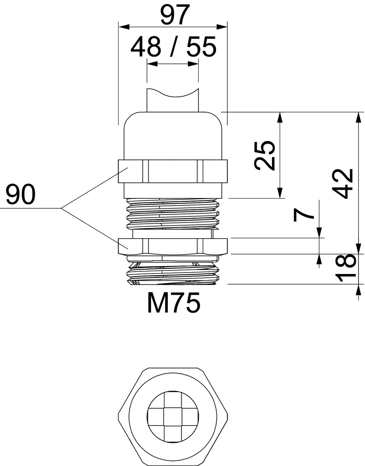 Bend protection no CO2 Footprint (GWP) Cradle-to-Gate 2,8746 kg CO2e / 1 Piece Dimension M75 Dimension E 97 mm Dimension L max. 42 mm Dimension L1 18 mm Dimension L2 7 mm Dimension L3 25 mm explosion-proof no Fibre-glass reinforced no Flat cable gland no For Ex zone Without Halogen-free no Impact-resistant no Material Brass Permitted temperature range, max. 100 °C Permitted temperature range, min. -20 °C Protection rating IP68 Sealing area D, max. 55 mm Sealing area D, min. 48 mm Sealing insert, multiple no Strain relief option yes Surface Nickel-plated Thread M75 x 1,5 Thread length 18 mm Thread type Metric Type of seal Sealing ring Version for Straight WAF 90 With locknut no - All types