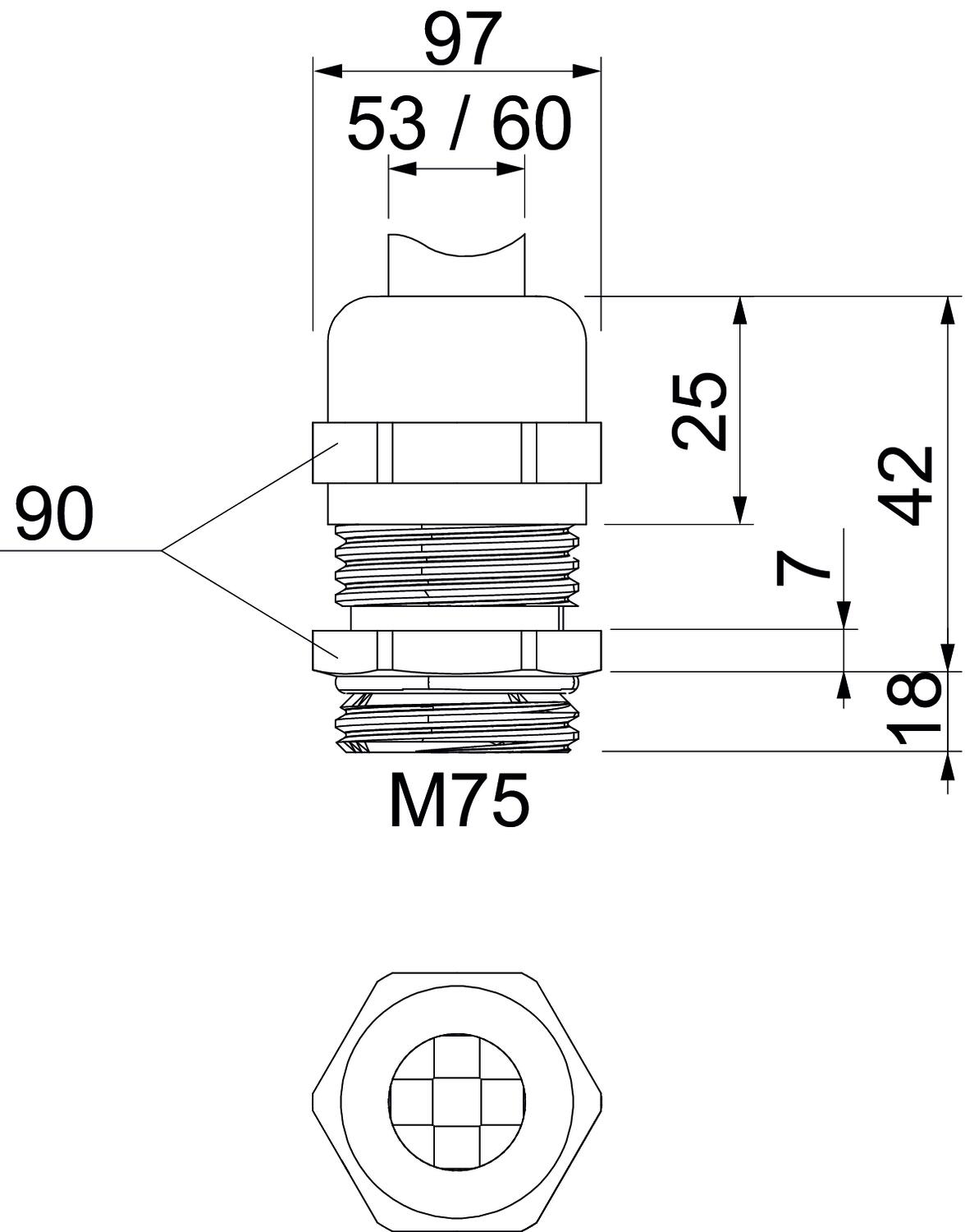 Bend protection no CO2 Footprint (GWP) Cradle-to-Gate 2,5159 kg CO2e / 1 Piece Dimension M75 Dimension E 97 mm Dimension L max. 42 mm Dimension L1 18 mm Dimension L2 7 mm Dimension L3 25 mm explosion-proof no Fibre-glass reinforced no Flat cable gland no For Ex zone Without Halogen-free no Impact-resistant no Material Brass Permitted temperature range, max. 100 °C Permitted temperature range, min. -20 °C Protection rating IP68 Sealing area D, max. 60 mm Sealing area D, min. 53 mm Sealing insert, multiple no Strain relief option yes Surface Nickel-plated Thread M75 x 1,5 Thread length 18 mm Thread type Metric Type of seal Sealing ring Version for Straight WAF 90 With locknut no - All types