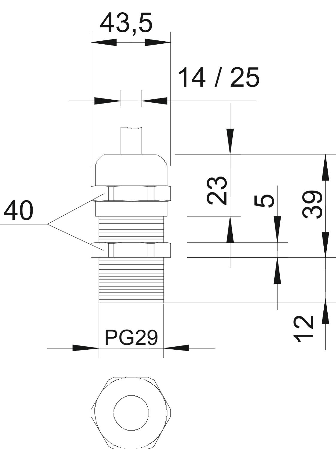 Bend protection no CO2 Footprint (GWP) Cradle-to-Gate 0,4261 kg CO2e / 1 Piece Dimension PG29 Dimension E 43,5 mm Dimension L max. 39 mm Dimension L1 12 mm Dimension L2 5 mm Dimension L3 23 mm explosion-proof no Fibre-glass reinforced no Flat cable gland no For Ex zone Without For Ex zone dust Without For Ex zone gas Without Halogen-free no Impact-resistant no Material Brass Nominal thread size 29 Permitted temperature range, max. 100 °C Permitted temperature range, min. -20 °C Protection rating IP68 Sealing area D, max. 25 mm Sealing area D, min. 18 mm Sealing insert, multiple no Splittable gland no Strain relief option yes Surface Nickel-plated Thread Pg 29 Thread length 12 mm Thread type PG Type of seal Sealing ring Version for Straight WAF 40 With locknut no - All types