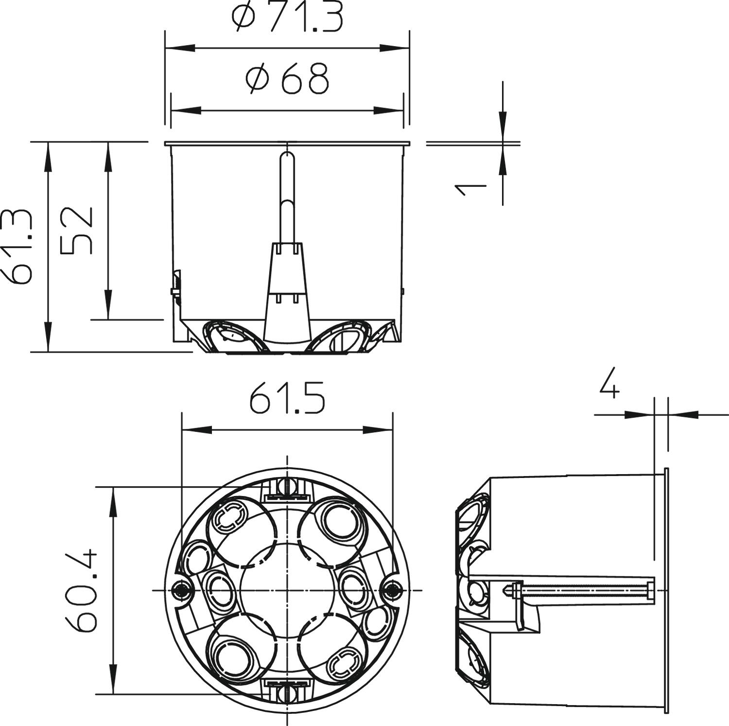 Accessory screw clearance 60 mm Airtight no CO2 Footprint (GWP) Cradle-to-Gate 0,2038 kg CO₂e / 1 Piece Colour Orange Cover Without Cover fastening Not applicable Device fixing Screws , Diameter 68 mm Dimension Ø68mm, H61mm Entry from rear yes Equipment Without Flame-resistant Acc. to VDE 0471/DIN 695 Part 2-1, test temperature 850°C Floor height, min. 61 mm for pipe diameter 20 mm Halogen-free yes Height 61 mm Impact-resistant no Maintain electrical functions Without Material Polypropylene Max. Conductor cross-section 2,5 mm² Milling hole diameter 68 mm No. of entries 8 Nominal cross-section, max. 2,5 mm² Nominal cross-section, min. 1,5 mm² Number of switch boxes 1 Protection rating IP30 Rated voltage 400 V Sealable no Shape Round Suitable for plate thickness, max. 35 mm Suitable for plate thickness, min. 7 mm Support Without Type of entry break-out openings for NYM cables, data cables and pipes Ø 20 mm Type of housing penetration Pre-marking With bolts yes With nail strap no With screening no - All types