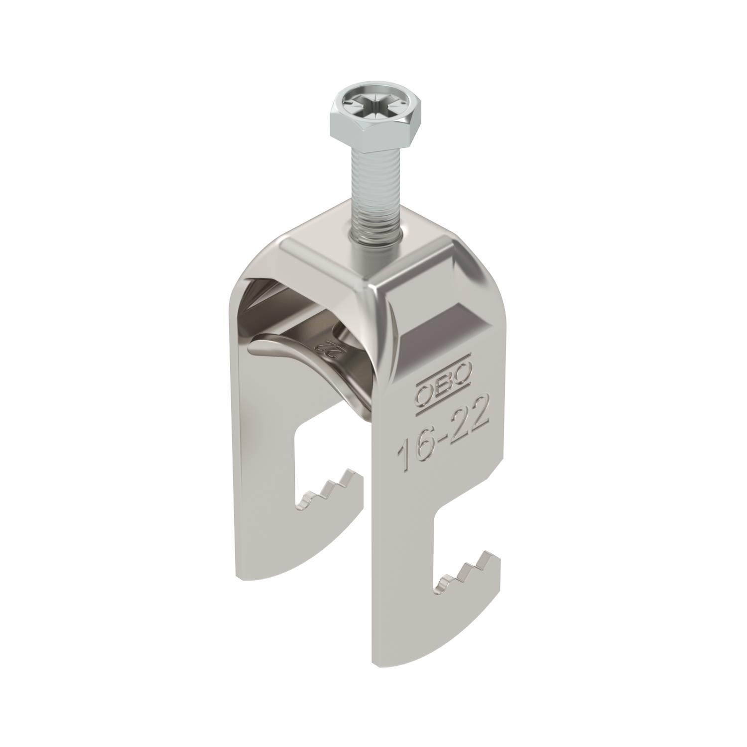 Product descriptionClamp clip with F-foot, metal pressure sleeve with rounded edges to protect the cable. For vertical and horizontal mounting of 1 single cable on flat bars. With 1-start screw thread on pressure sleeve, universal hexagonal screw head WAF10, with slot and cross recess. Suitable for assembly indoors and outdoors. We recommend the use of a counter-sleeve.