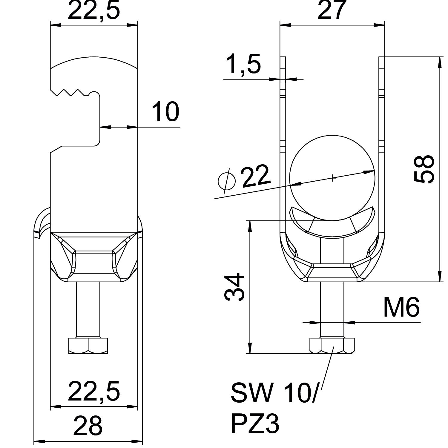 Clamping range D, max. 22 mm Clamping range D, min. 16 mm CO2 Footprint (GWP) Cradle-to-Gate 0,3254 kg CO2e / 1 Piece Dimension 16-22mm Dimension A 22,5 mm Dimension B 27 mm Dimension C 28 mm Dimension G (mm) M6 Dimension H 58 mm Dimension L 34 mm Dimension t 1,5 mm For pipe diameter, max. 22 mm For pipe diameter, min. 16 mm Halogen-free yes Height 58 mm Length 22,5 mm Length of external dimensions 28 mm Material Stainless steel 1.4301 Material addition Rustproof steel Material of trough Rustproof steel Material quality of trough Stainless steel 304 (1.4301) Max. Tightening torque 3 Nm Mounting type Flat profile Number of cables/pipes 1 Plate thickness 1,5 mm Slot width 10 mm Surface Bright, treated Surface addition Untreated Thread M6 Width 27 mm With counter-trough no With metal trough yes - All types