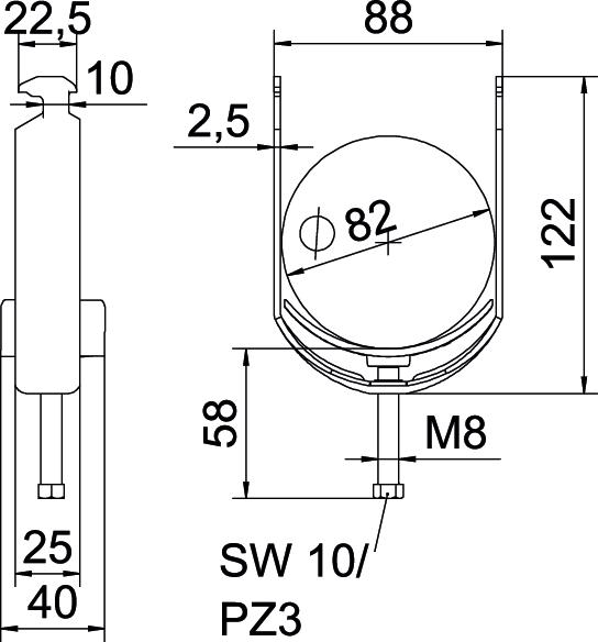 Clamping range D, max. 82 mm Clamping range D, min. 76 mm CO2 Footprint (GWP) Cradle-to-Gate 0,4838 kg CO2e / 1 Piece Dimension 76-82mm Dimension A 25 mm Dimension B 88 mm Dimension C 40 mm Dimension G (mm) M8 Dimension H 122 mm Dimension L 58 mm Dimension t 2,5 mm For pipe diameter, max. 82 mm For pipe diameter, min. 76 mm for rail with slot width (with interval), max. 17 mm for rail with slot width (with interval), min. 16 mm Halogen-free yes Height 122 mm Length 25 mm Length of external dimensions 40 mm Material Steel Material addition Steel Material of trough Plastic Material quality of trough Polypropylene Max. Tightening torque 5 Nm Mounting type Profile rail Number of cables/pipes 1 Plate thickness 2,5 mm Slot width 10 mm Surface Hot-dip galvanised Surface addition hot galvanised Thread M8 Width 88 mm With counter-trough no With plastic trough yes - All types
