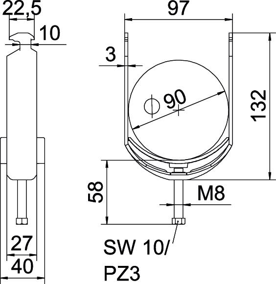 Clamping range D, max. 90 mm Clamping range D, min. 82 mm CO2 Footprint (GWP) Cradle-to-Gate 0,6203 kg CO2e / 1 Piece Dimension 82-90mm Dimension A 27 mm Dimension B 97 mm Dimension C 40 mm Dimension G (mm) M8 Dimension H 132 mm Dimension L 58 mm Dimension t 3 mm For pipe diameter, max. 90 mm For pipe diameter, min. 82 mm for rail with slot width (with interval), max. 17 mm for rail with slot width (with interval), min. 16 mm Halogen-free yes Height 132 mm Length 27 mm Length of external dimensions 40 mm Material Steel Material addition Steel Material of trough Plastic Material quality of trough Polypropylene Max. Tightening torque 5 Nm Mounting type Profile rail Number of cables/pipes 1 Plate thickness 3 mm Slot width 10 mm Surface Hot-dip galvanised Surface addition hot galvanised Thread M8 Width 97 mm With counter-trough no With plastic trough yes - All types