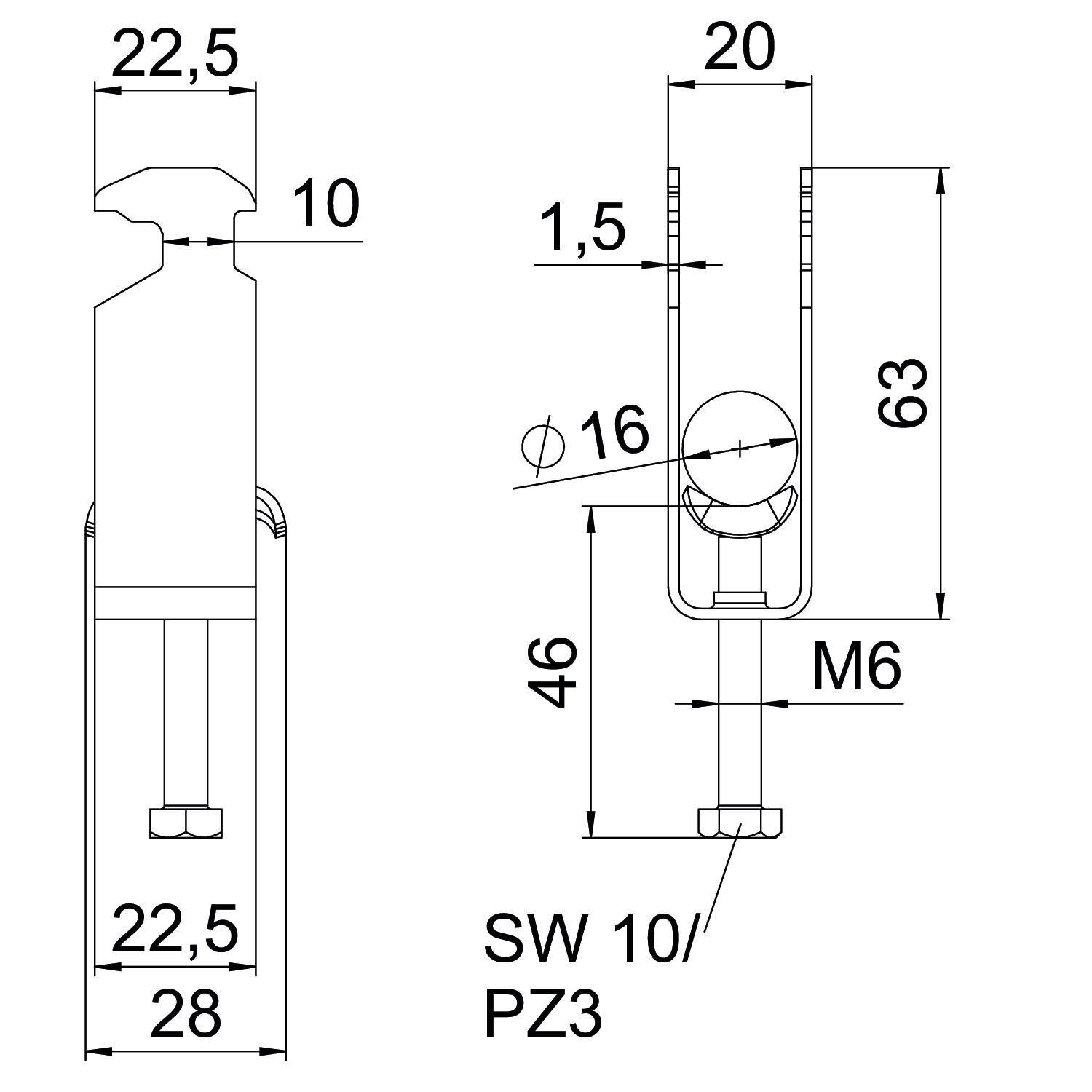 Clamping range D, max. 16 mm Clamping range D, min. 12 mm CO2 Footprint (GWP) Cradle-to-Gate 0,3414 kg CO2e / 1 Piece Dimension 12-16mm Dimension A 22,5 mm Dimension B 20 mm Dimension C 28 mm Dimension G (mm) M6 Dimension H 63 mm Dimension L 46 mm Dimension t 1,5 mm For pipe diameter, max. 16 mm For pipe diameter, min. 12 mm for rail with slot width (with interval), max. 17 mm for rail with slot width (with interval), min. 16 mm Halogen-free yes Height 63 mm Length 22,5 mm Length of external dimensions 28 mm Material Stainless steel 1.4301 Material addition Rustproof steel Material of trough Rustproof steel Material quality of trough Stainless steel 304 (1.4301) Max. Tightening torque 3 Nm Mounting type Profile rail Number of cables/pipes 2 Plate thickness 1,5 mm Slot width 10 mm Surface Bright, treated Surface addition Untreated Thread M6 Width 20 mm With counter-trough no With metal trough yes With plastic trough no - All types