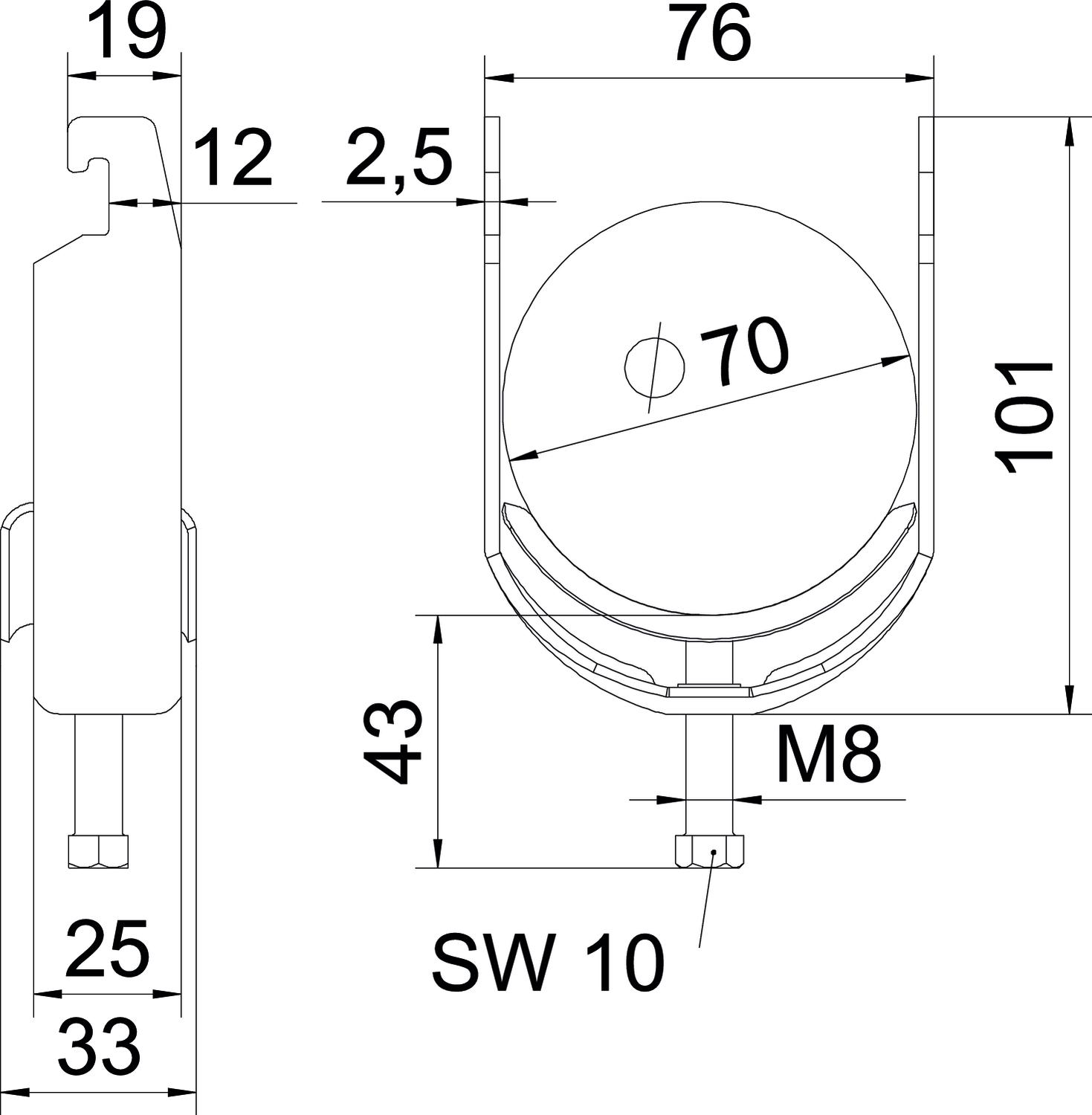 Clamping range D, max. 70 mm Clamping range D, min. 64 mm CO2 Footprint (GWP) Cradle-to-Gate 0,374 kg CO2e / 1 Piece Dimension 64-70mm Dimension A 25 mm Dimension B 76 mm Dimension C 33 mm Dimension G (mm) M8 Dimension H 101 mm Dimension L 43 mm Dimension t 2,5 mm For pipe diameter, max. 70 mm For pipe diameter, min. 64 mm for rail with slot width (with interval), max. 22 mm for rail with slot width (with interval), min. 18 mm Halogen-free yes Height 101 mm Length 25 mm Length of external dimensions 33 mm Maintain electrical functions yes Material Steel Material addition Steel Material of trough Steel Max. Tightening torque 5 Nm Mounting type Profile rail Number of cables/pipes 1 Plate thickness 2,5 mm Slot width 10 mm Surface Hot-dip galvanised Surface addition hot galvanised Thread M8 Width 76 mm With counter-trough no With metal trough yes - All types
