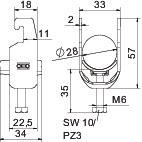 Product descriptionClamp clip with U-foot, plastic pressure sleeve made of polypropylene. For vertical and horizontal mounting of 1 single cable on a C-profile rail. For slot width 18–22 mm. With 1-start screw thread on pressure sleeve, universal hexagonal screw head WAF10, with slot and cross recess. Suitable for assembly indoors and outdoors. We recommend the use of a counter-sleeve.