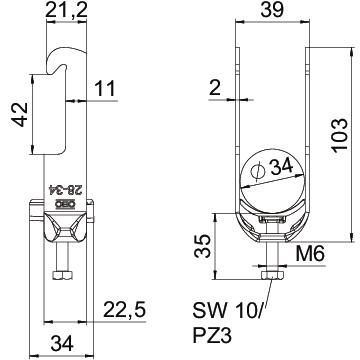 Clamping range D, max. 34 mm Clamping range D, min. 28 mm CO2 Footprint (GWP) Cradle-to-Gate 0,1945 kg CO2e / 1 Piece Dimension 28-34mm Dimension A 22,5 mm Dimension B 39 mm Dimension C 34 mm Dimension G (mm) M6 Dimension H 103 mm Dimension L 35 mm Dimension t 2 mm For pipe diameter, max. 34 mm For pipe diameter, min. 28 mm Halogen-free yes Height 103 mm Length 22,5 mm Length of external dimensions 34 mm Material Steel Material addition Steel Material of trough Plastic Material quality of trough Polypropylene Max. Tightening torque 3 Nm Mounting type Angle profile Number of cables/pipes 1 Plate thickness 2 mm Slot width 10 mm Surface Hot-dip galvanised Surface addition hot galvanised Thread M6 Width 39 mm With counter-trough no With plastic trough yes - All types