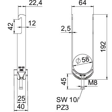 Clamping range D, max. 58 mm Clamping range D, min. 52 mm CO2 Footprint (GWP) Cradle-to-Gate 0,6465 kg CO2e / 1 Piece Dimension 52-58mm Dimension A 25 mm Dimension B 64 mm Dimension C 40 mm Dimension G (mm) M8 Dimension H 192 mm Dimension L 45 mm Dimension t 2,5 mm For pipe diameter, max. 58 mm For pipe diameter, min. 52 mm Halogen-free yes Height 192 mm Length 25 mm Length of external dimensions 40 mm Material Steel Material addition Steel Material of trough Plastic Material quality of trough Polypropylene Max. Tightening torque 5 Nm Mounting type Angle profile Number of cables/pipes 2 Plate thickness 2,5 mm Slot width 10 mm Surface Hot-dip galvanised Surface addition hot galvanised Thread M8 Width 64 mm With counter-trough no With plastic trough yes - All types