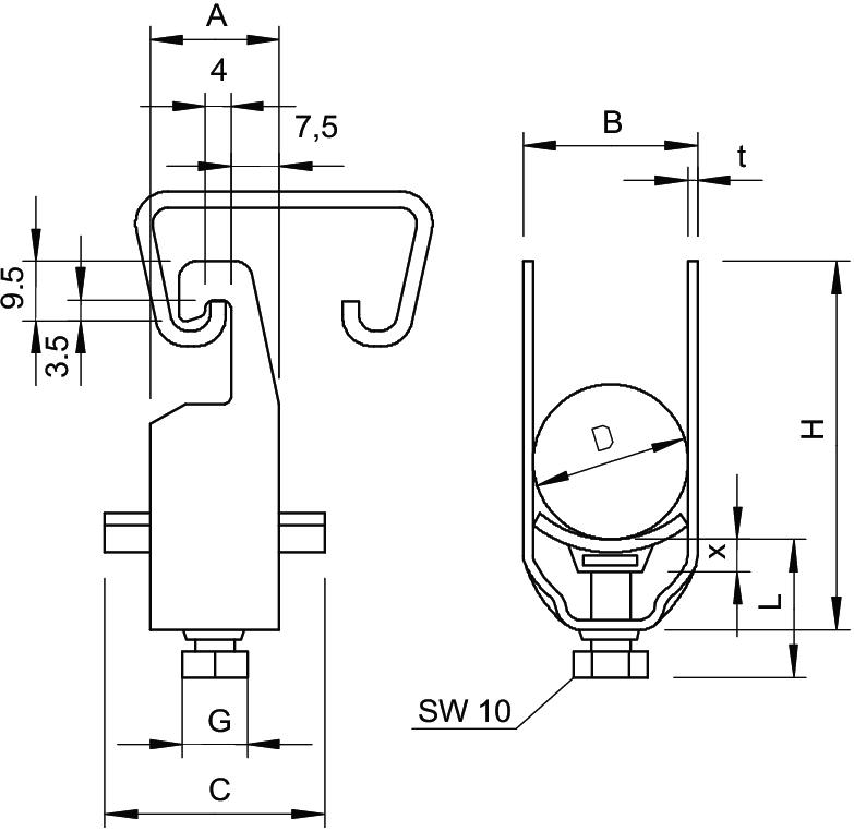 Clamping range D, max. 70 mm Clamping range D, min. 64 mm CO2 Footprint (GWP) Cradle-to-Gate 0,6465 kg CO₂e / 1 Piece Dimension 64-70mm Dimension A 23 mm Dimension B 76 mm Dimension C 40 mm Dimension G (mm) M8 Dimension H 103 mm Dimension L 38,5 mm Dimension t 2,5 mm Dimension x 6,5 mm for 1 cable H 103 mm for 1 cable L 38,5 for rail with slot width (with interval), max. 22 mm for rail with slot width (with interval), min. 18 mm Halogen-free yes Impact-resistant no Material Stainless steel 1.4301 Material addition Rustproof steel Material of trough Plastic Material quality of trough Polypropylene Max. Tightening torque 5 Nm Mounting type Profile rail Number of cables/pipes 1 Surface Bright, treated Surface addition Untreated With counter-trough no With metal trough no With plastic trough yes - All types