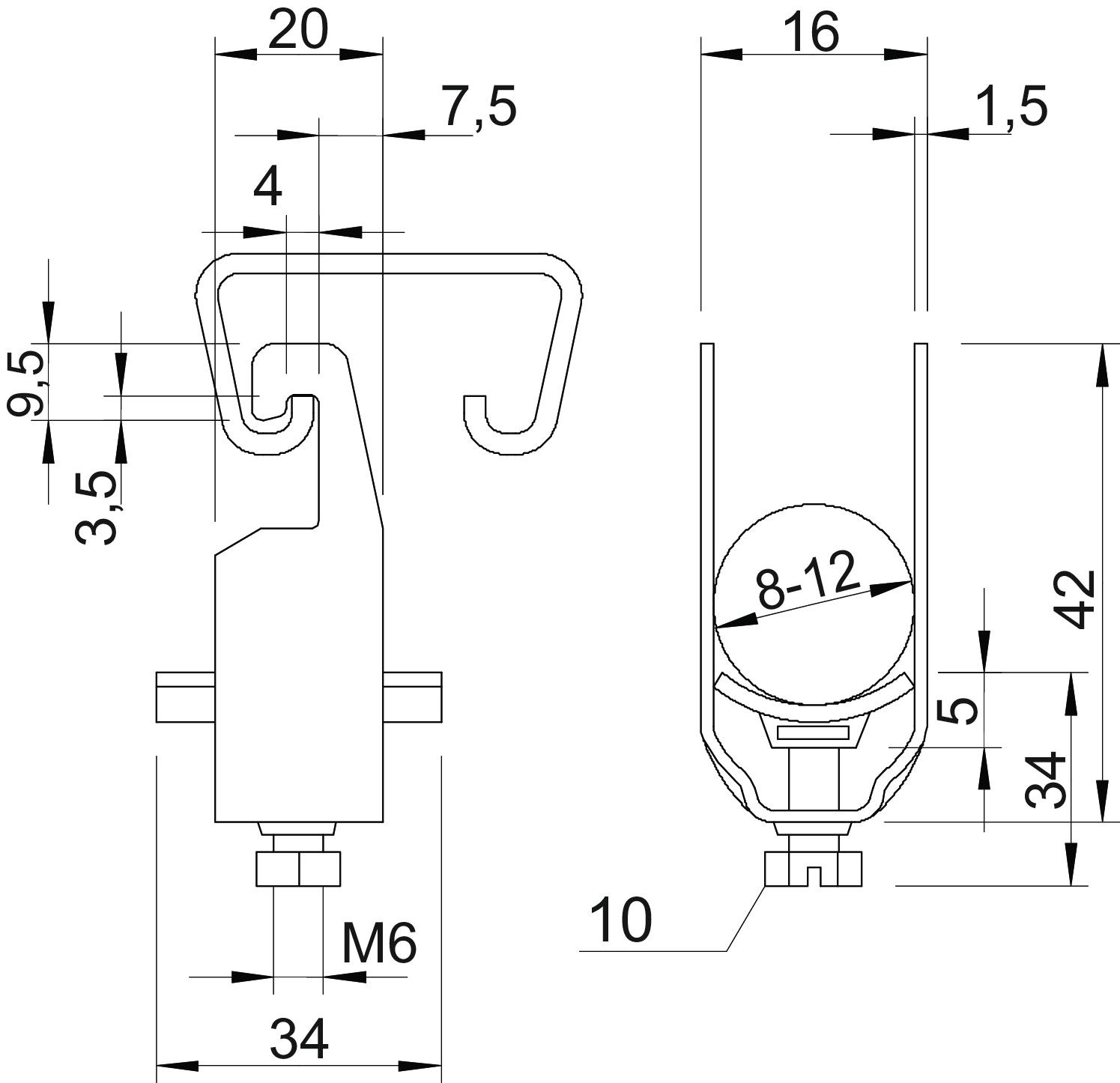 Clamping range D, max. 12 mm Clamping range D, min. 8 mm CO2 Footprint (GWP) Cradle-to-Gate 0,1706 kg CO₂e / 1 Piece Dimension 8-12mm Dimension A 20 mm Dimension B 16 mm Dimension C 34 mm Dimension G (mm) M6 Dimension H 42 mm Dimension L 34 mm Dimension t 1,5 mm Dimension x 5 mm for 1 cable H 42 mm for 1 cable L 34 for rail with slot width (with interval), max. 22 mm for rail with slot width (with interval), min. 18 mm Halogen-free yes Impact-resistant no Material Stainless steel 1.4301 Material addition Rustproof steel Material of trough Plastic Material quality of trough Polypropylene Max. Tightening torque 3 Nm Mounting type Profile rail Number of cables/pipes 1 Surface Bright, treated Surface addition Untreated With counter-trough no With metal trough no With plastic trough yes - All types