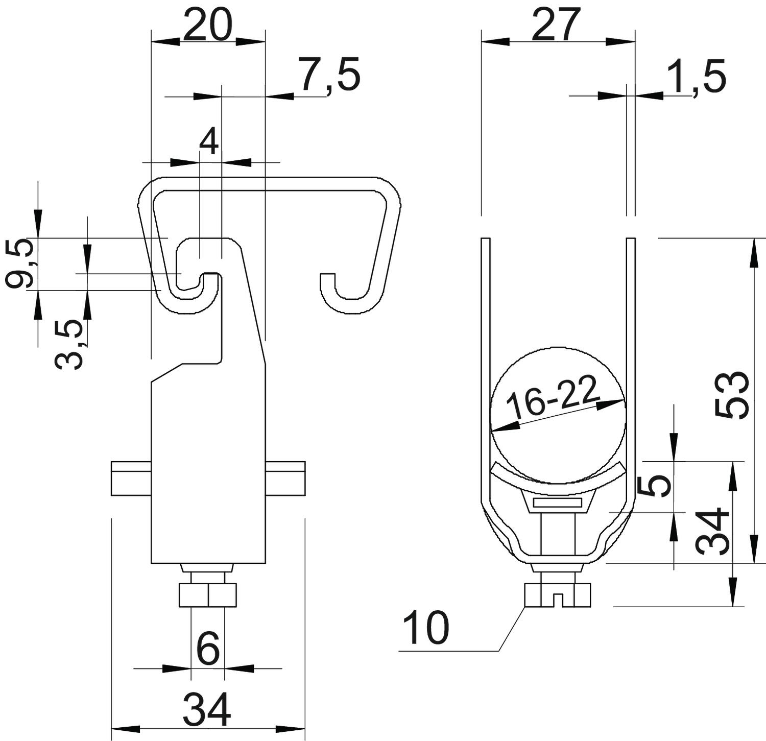 Clamping range D, max. 22 mm Clamping range D, min. 16 mm CO2 Footprint (GWP) Cradle-to-Gate 0,0859 kg CO₂e / 1 Piece Dimension 16-22mm Dimension A 20 mm Dimension B 27 mm Dimension C 34 mm Dimension G (mm) M6 Dimension H 53 mm Dimension L 34 mm Dimension t 1,5 mm Dimension x 5 mm For pipe diameter, max. 20 mm For pipe diameter, min. 20 mm for rail with slot width (with interval), max. 22 mm for rail with slot width (with interval), min. 18 mm Halogen-free no Impact-resistant no Material Steel Material addition Steel Material of trough Steel Max. Tightening torque 3 Nm Mounting type Profile rail Number of cables/pipes 1 Surface Hot-dip galvanised Surface addition hot galvanised With counter-trough no With metal trough yes With plastic trough no - All types