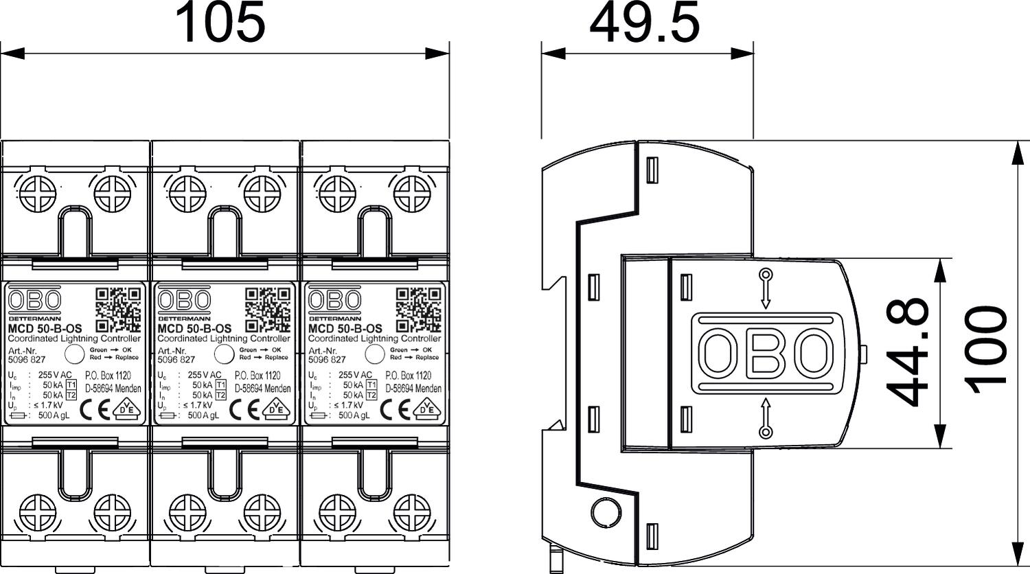 3 x MCD 50-B-OS: Type 1+2 coordinated lightning current arresters to DIN EN 61643-11. For interface 0 to 2 (LPZ) in accordance with lightning protection zone concept to IEC 62305 and/or VDE 0185-305.