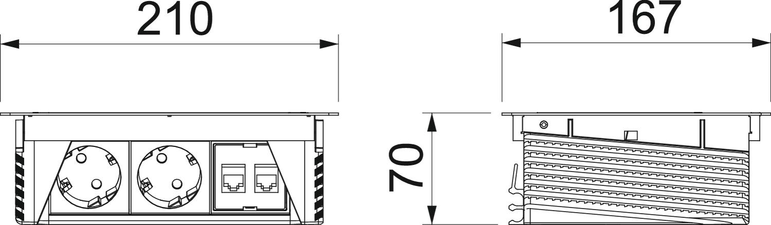 Dimension 210x167x68 Extendable no Foldable yes Installation depth 68 mm Length 210 mm Length of the supply cable 3 m Material Stainless steel 1.4301 Number of CAT 6 connections 2 Number of SCHUKO sockets 2 Surge protection no - All types