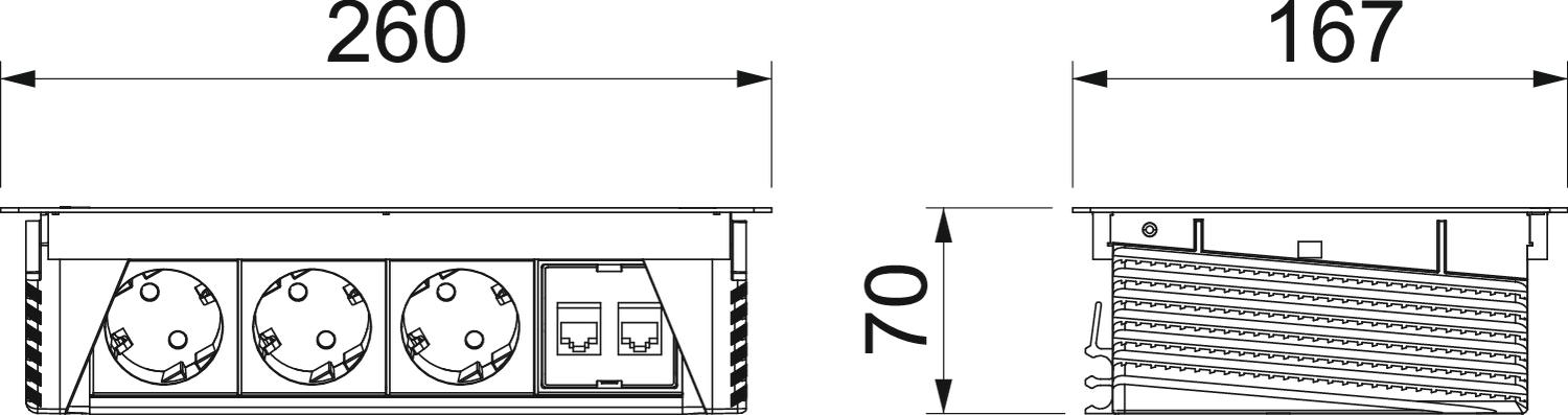 Dimension 260x167x68 Extendable no Foldable yes Installation depth 68 mm Length 260 mm Length of the supply cable 3 m Material Stainless steel 1.4301 Number of CAT 6 connections 2 Number of SCHUKO sockets 3 Surge protection no - All types