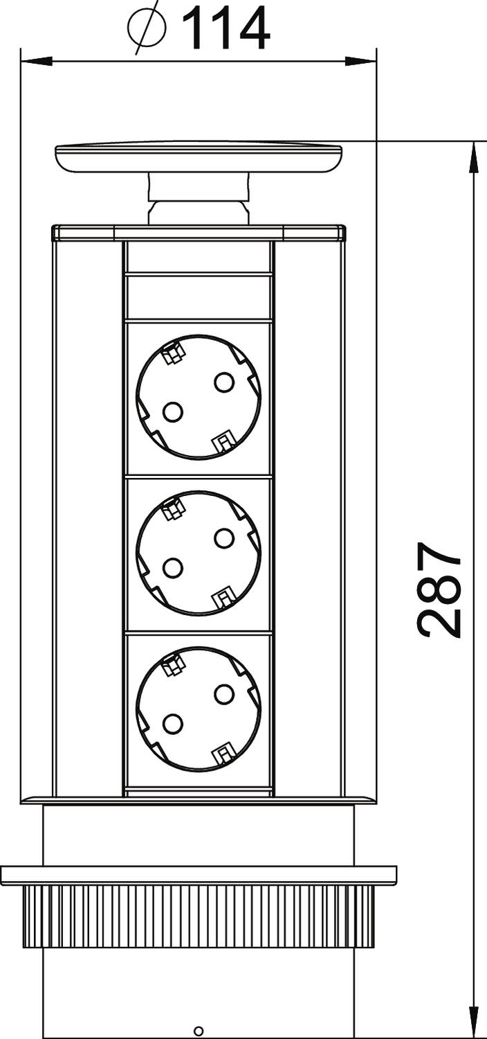 Colour aluminium Extendable yes External diameter 114 mm Foldable no Length 287 mm Length of the supply cable 3 m Material Aluminium Number of SCHUKO sockets 3 Surface Anodised Surge protection no Version for Stainless steel lid - All types