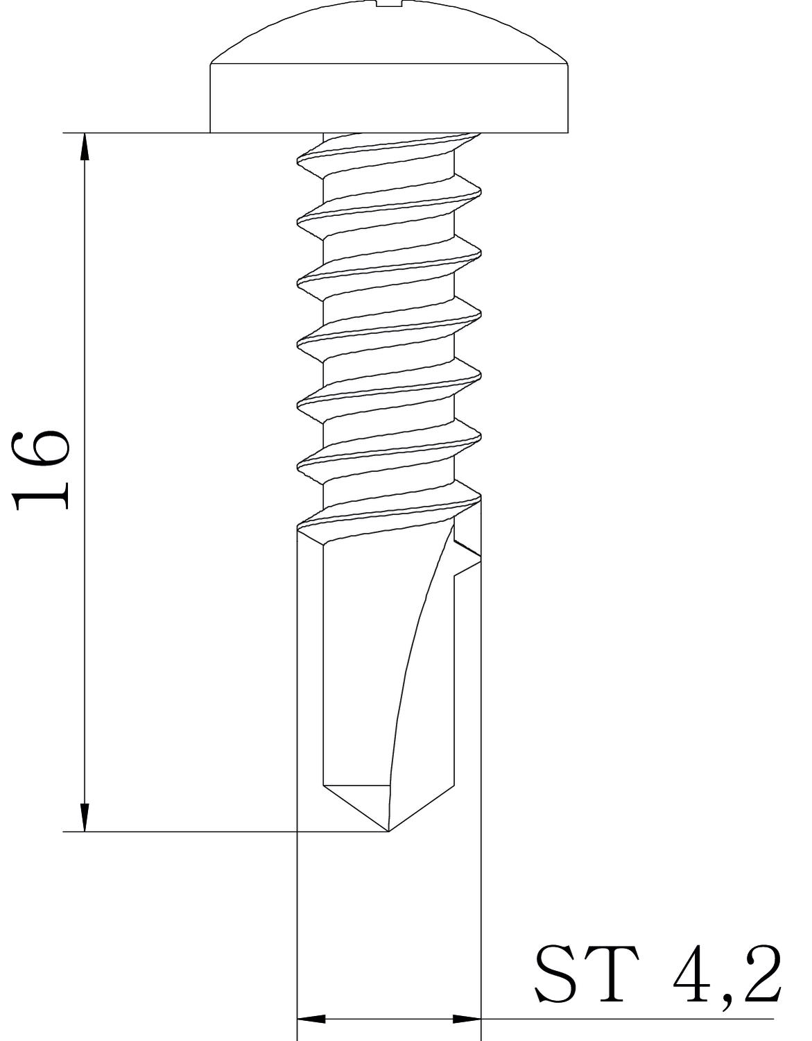 Colour zinc Dimension 4,2x16 Dimension M4,2x16 Dimension d 4,2 mm Dimension l 16 mm Head shape Flat sphere Length 16 mm Material Steel Screw system Phillips PH Surface Electrogalvanized Thread diameter ST 4,2 - All types