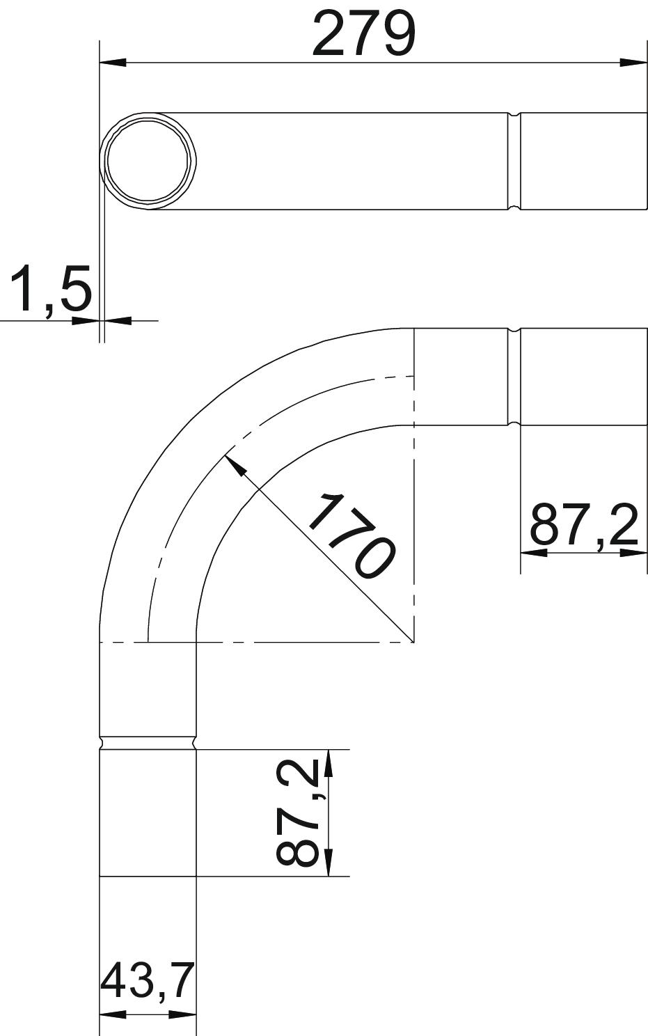Angle of the bend 90 ° Brushed surface no CO2 Footprint (GWP) Cradle-to-Gate 1,5699 kg CO2e / 1 Piece Dimension Ø40mm Dimension A 87,2 mm Dimension B 279 mm Dimension D 43,7 mm Dimension d 40,7 mm Dimension l 50 mm Dimension m (mm) M40 Dimension R 170 mm Dimension t 1,5 mm Flexible no For nominal pipe diameter 40 mm Halogen-free no Material Steel Polished surface no Surface Electrogalvanized Two-part no Version for Connector With inspection opening and lid no With sleeve yes - All types
