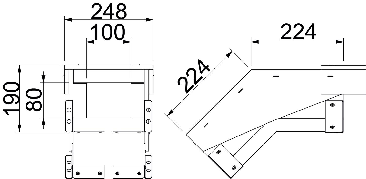 Angle of the bend 45 ° Classification EI − installation duct 90 Colour Grey Cover fastening Loose Dimension 100x80 Dimension b 100 mm Dimension B 248 mm Dimension H 190 mm Dimension h 80 mm Dimension L 224 mm Jacketing Without Material Fibreglass lightweight concrete Material of the insulation Glass-fibre lightweight concrete Number of flammable sides 4 With perforation no - All types