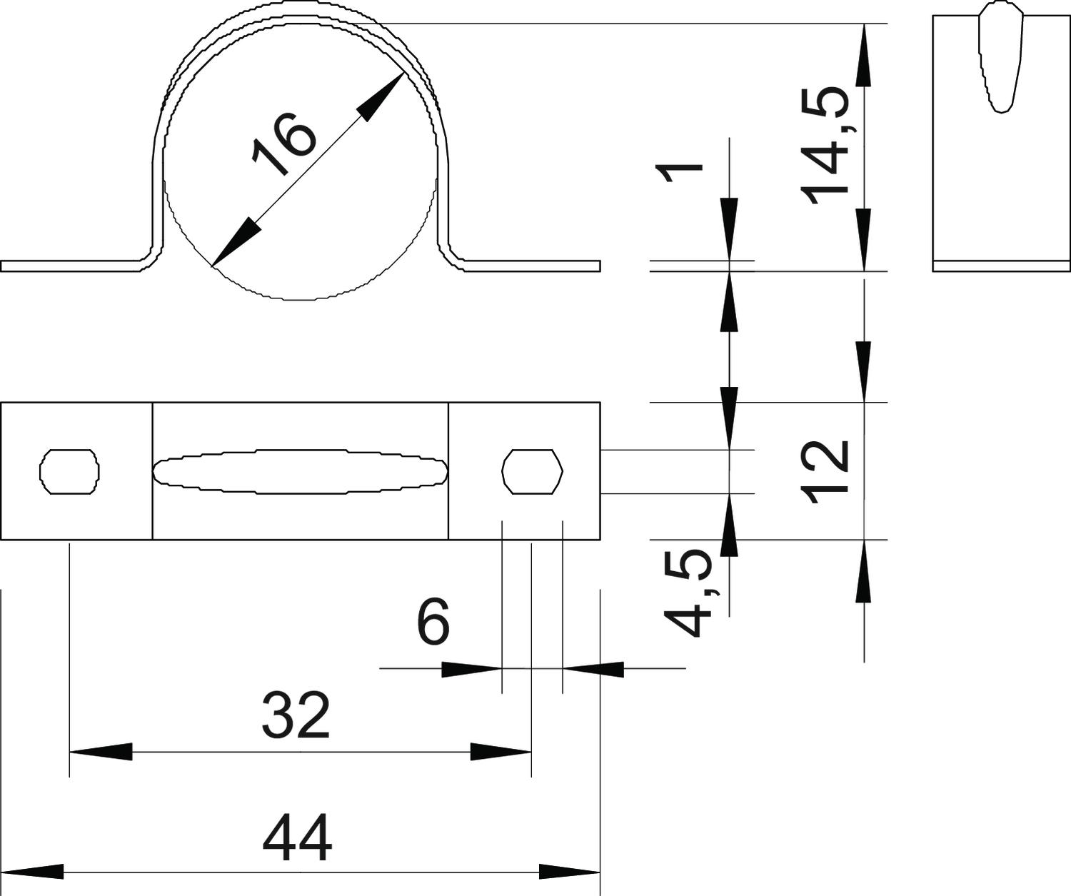 Clamping range D, max. 16 mm Clamping range D, min. 16 mm CO2 Footprint (GWP) Cradle-to-Gate 0,0371 kg CO2e / 1 Piece Dimension 16mm Dimension A 44 mm Dimension b 12 mm Dimension B 32 mm Dimension D 16 mm Dimension d 4,5 mm Dimension e 6 mm Dimension H 14,5 mm Dimension t 1 mm Distance to the wall no Fastening type Screw hole For diameter 16 Halogen-free yes Height 14,5 mm Hole size 4,5 x 6 mm Length 44 mm Material Aluminium Material thickness 1 mm Nominal diameter 16 mm Number of cables/pipes 1 Plastic-covered no Suitable in fire protection area no UV-resistant yes Version for Two-lobe Width 12 mm - All types