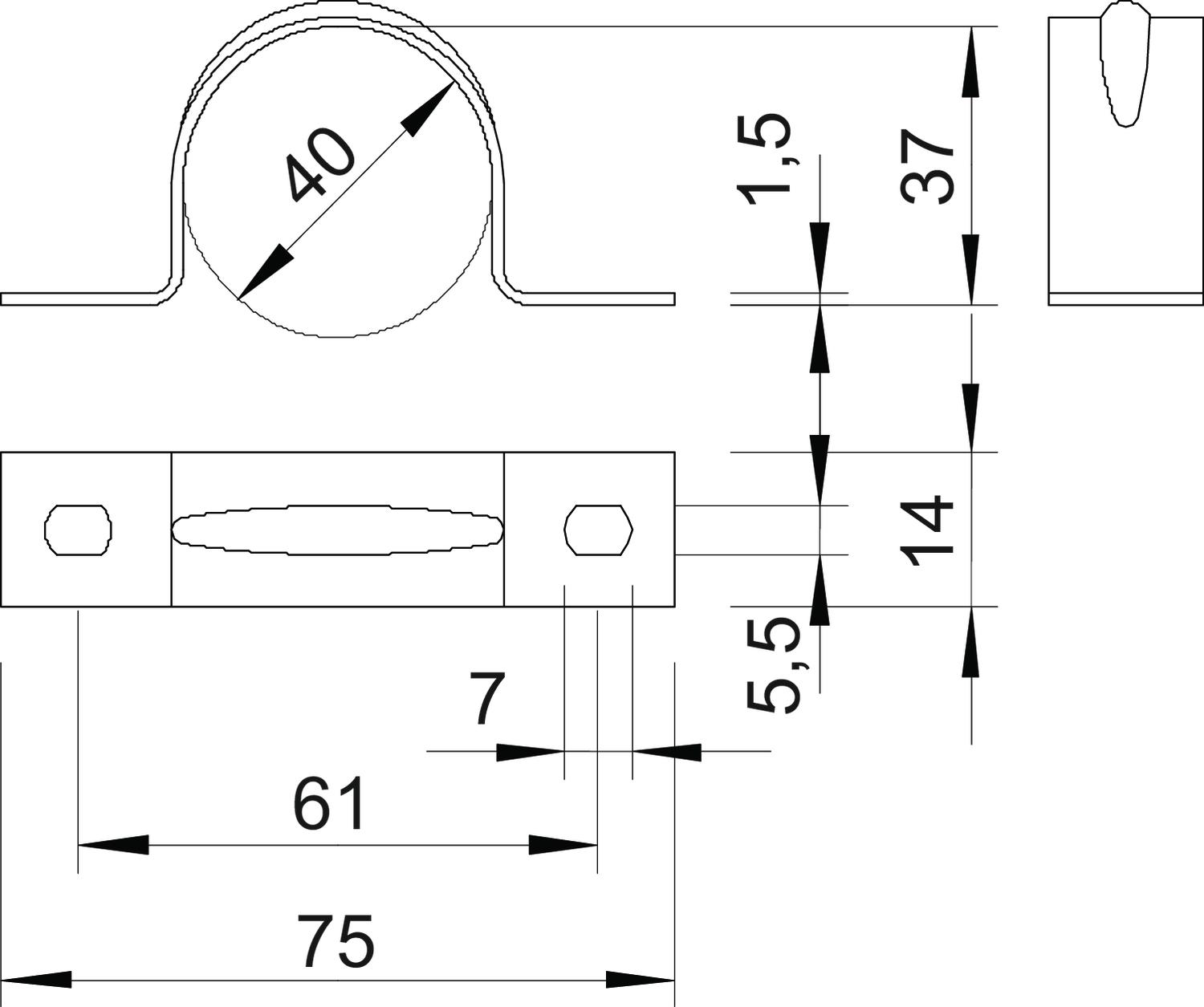 Clamping range D, max. 40 mm Clamping range D, min. 40 mm CO2 Footprint (GWP) Cradle-to-Gate 0,1229 kg CO2e / 1 Piece Dimension 40mm Dimension A 75 mm Dimension B 61 mm Dimension b 14 mm Dimension D 40 mm Dimension d 5,5 mm Dimension e 7 mm Dimension H 37 mm Dimension t 1,5 mm Distance to the wall no Fastening type Screw hole For diameter 40 Halogen-free yes Height 37 mm Hole size 5,5 x 7 mm Length 75 mm Material Aluminium Material thickness 1,5 mm Nominal diameter 40 mm Number of cables/pipes 1 Plastic-covered no Suitable in fire protection area no UV-resistant yes Version for Two-lobe Width 14 mm - All types