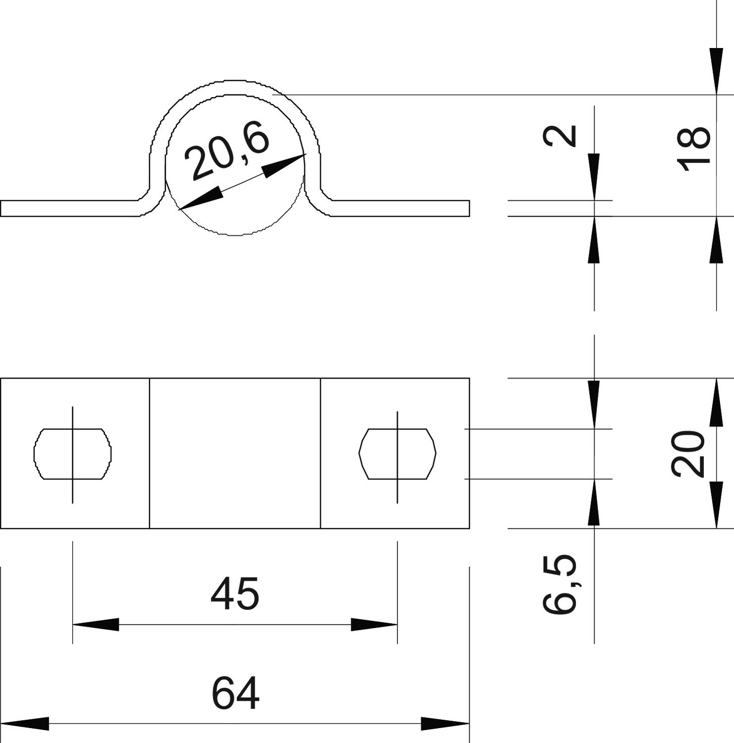 CO2 Footprint (GWP) Cradle-to-Gate 0,0624 kg CO2e / 1 Piece Dimension 20mm Dimension A 64 mm Dimension b 20 mm Dimension B 45 mm Dimension d 6,5 mm Dimension D 20,4 mm Dimension e 10 mm Dimension H 18 mm Dimension t 2 mm Distance to the wall no Fastening type Screw hole For diameter 20 Halogen-free yes Height 18 mm Hole size 6,5 x 10 mm Length 64 mm Material Steel Material thickness 2 mm Nominal diameter 20 mm Number of cables/pipes 1 Plastic-covered no Suitable in fire protection area no Surface Hot-dip galvanised UV-resistant yes Version for Two-lobe Width 20 mm - All types