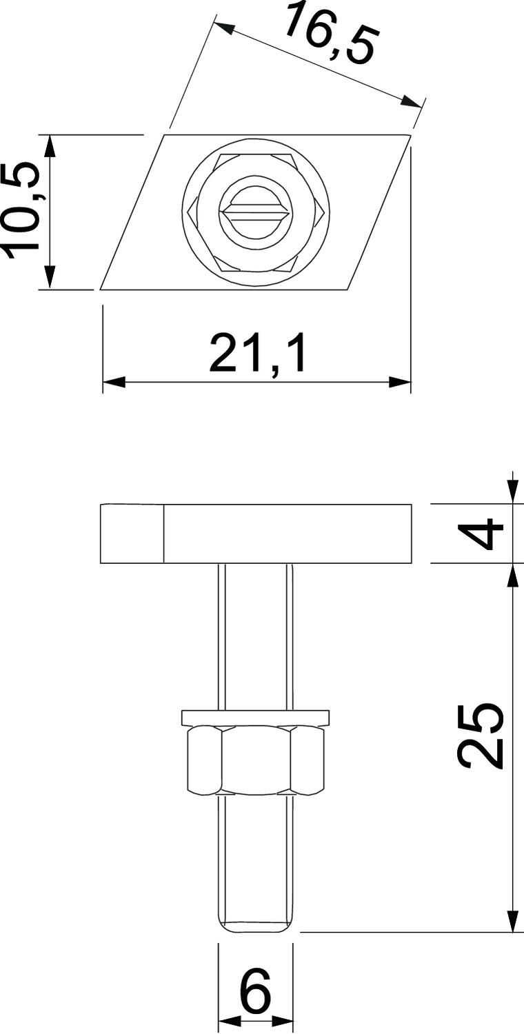 CO2 Footprint (GWP) Cradle-to-Gate 0,0121 kg CO2e / 1 Piece Dimension M6x25mm Dimension L 25 mm Height 4 mm Length 21,1 mm Material Steel Suitable for mounting rail yes Surface Zinc slat Thread M 6 x 25mm Thread metric 6 Width 10,5 mm - All types