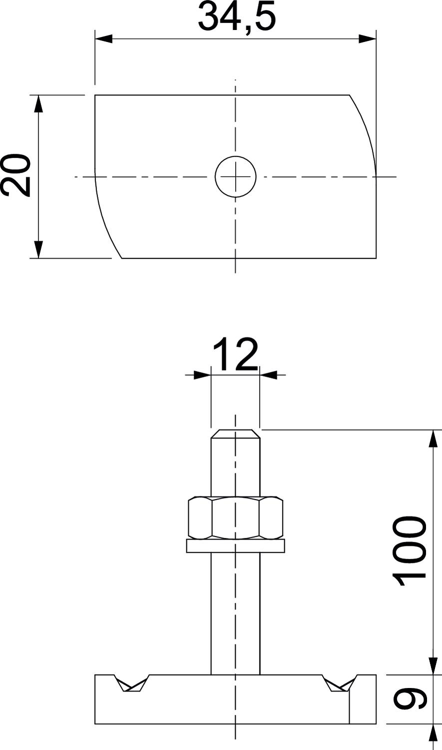 CO2 Footprint (GWP) Cradle-to-Gate 0,7894 kg CO2e / 1 Piece Dimension M12x100mm Dimension H 9 mm Dimension L 100 mm Height 9 mm Length 34,5 mm Material Stainless steel Suitable for mounting rail yes Surface Bright, treated Thread M 12 x 100 Torque 14,4 Nm Washer Ø 24 mm Width 20 mm - All types