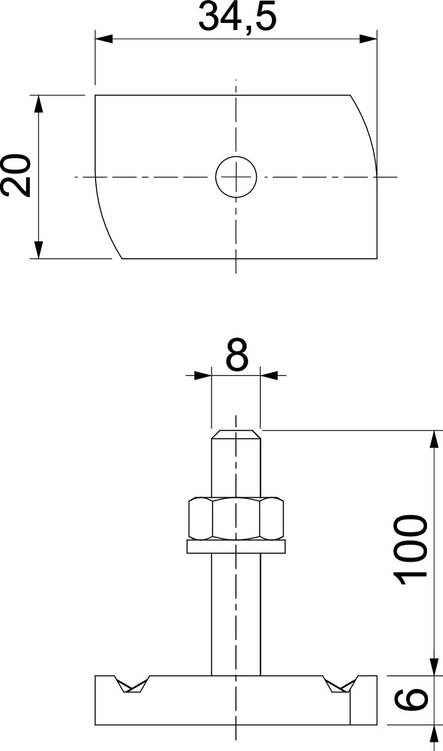 CO2 Footprint (GWP) Cradle-to-Gate 0,2041 kg CO2e / 1 Piece Dimension M8x100mm Dimension H 6 mm Dimension L 100 mm Height 6 mm Length 34,5 mm Material Steel Suitable for mounting rail yes Surface Zinc slat Thread M 8 x 100 Torque 8 Nm Washer Ø 16 mm Width 20 mm - All types