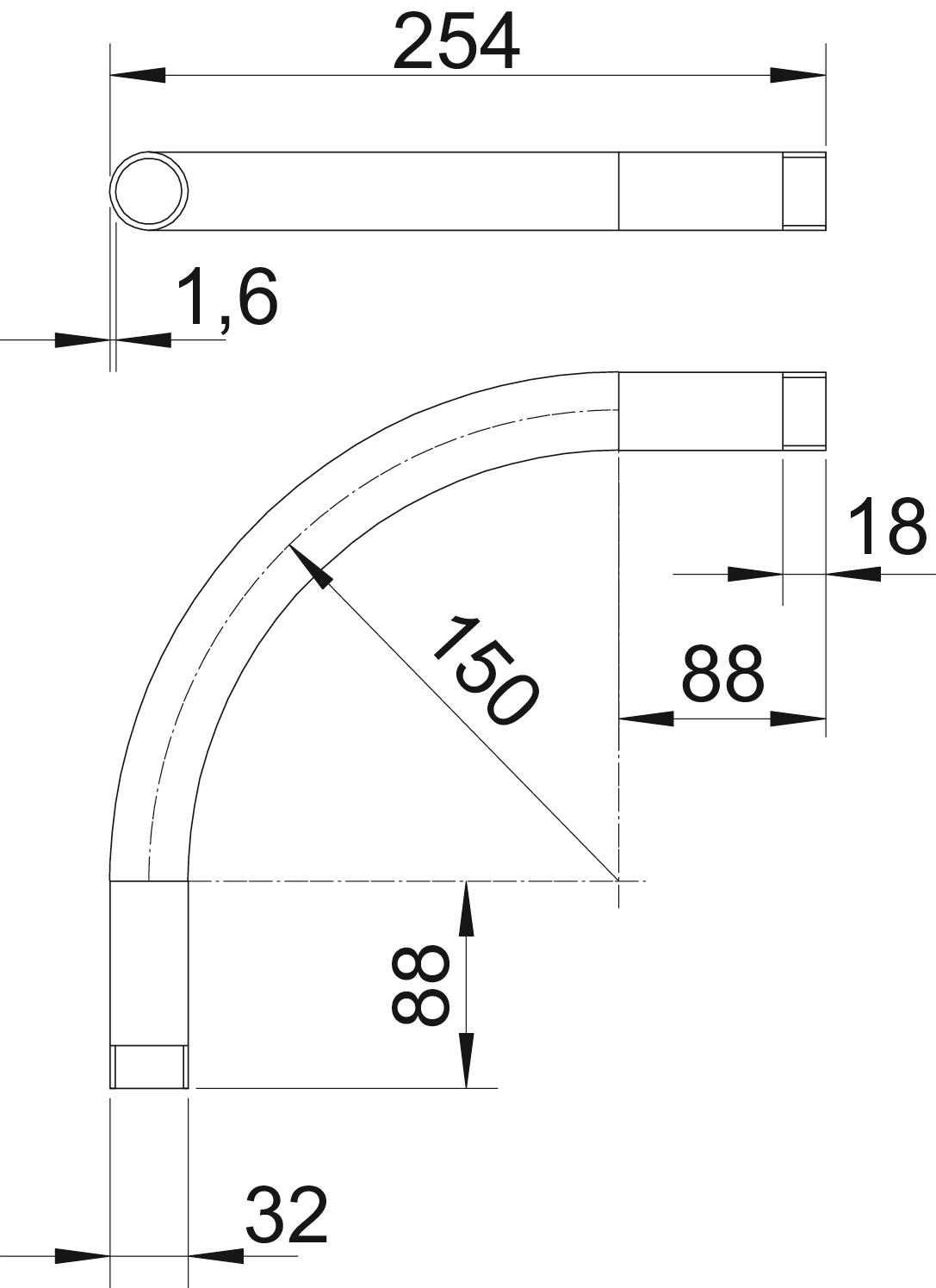Angle of the bend 90 ° Brushed surface no CO2 Footprint (GWP) Cradle-to-Gate 1,7758 kg CO2e / 1 Piece Dimension M32x1,5 Dimension A 88 mm Dimension B 254 mm Dimension D 32 mm Dimension l 18 mm Dimension m (mm) M32 Dimension R 150 mm Dimension t 1,6 mm Flexible no For nominal pipe diameter 32 mm Halogen-free no Material Steel Polished surface no Surface Hot-dip galvanised Thread M32x1,5 Two-part no Version for Thread With inspection opening and lid no With sleeve yes - All types