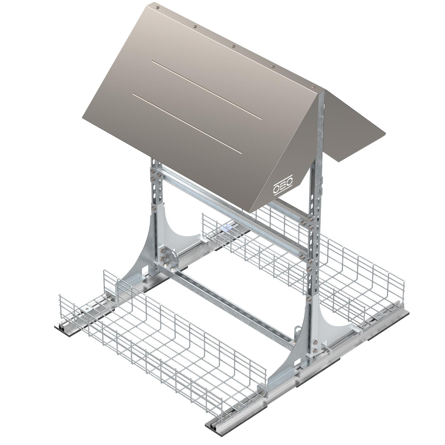 Product descriptionInverter frame for the protected installation of several inverters for PV systems on flat roofs. Free-standing. Loading on both sides possible. 2 mesh cable trays included for ballasting and for the routing of cables.